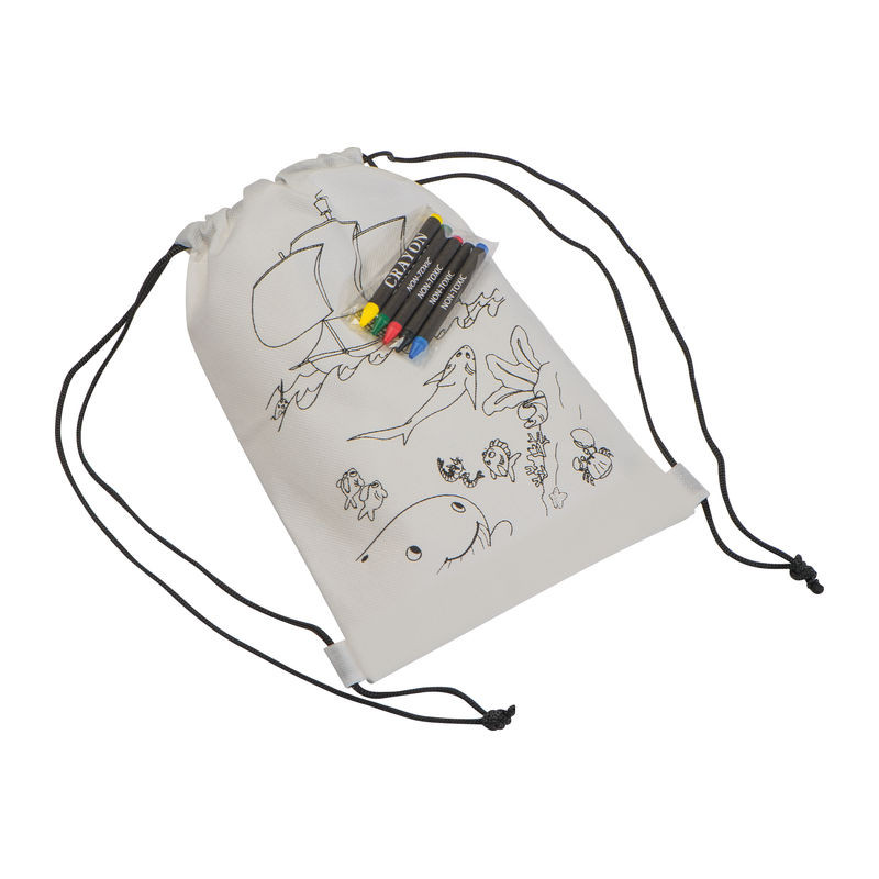 Kifestős tornazsák szett, mely egy motívumokkal ellátott non-woven hátizsákot és egy 5 darabos zsírkréta szettet tartalmaz a táska kiszínezéséhez.