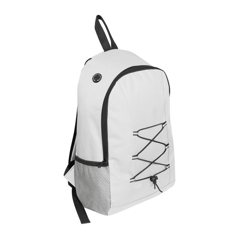 600D poliészterből készült hátizsák akasztóval, két oldalsó zsebbel, fejhallgató kimenettel és két párnázott vállpánttal.