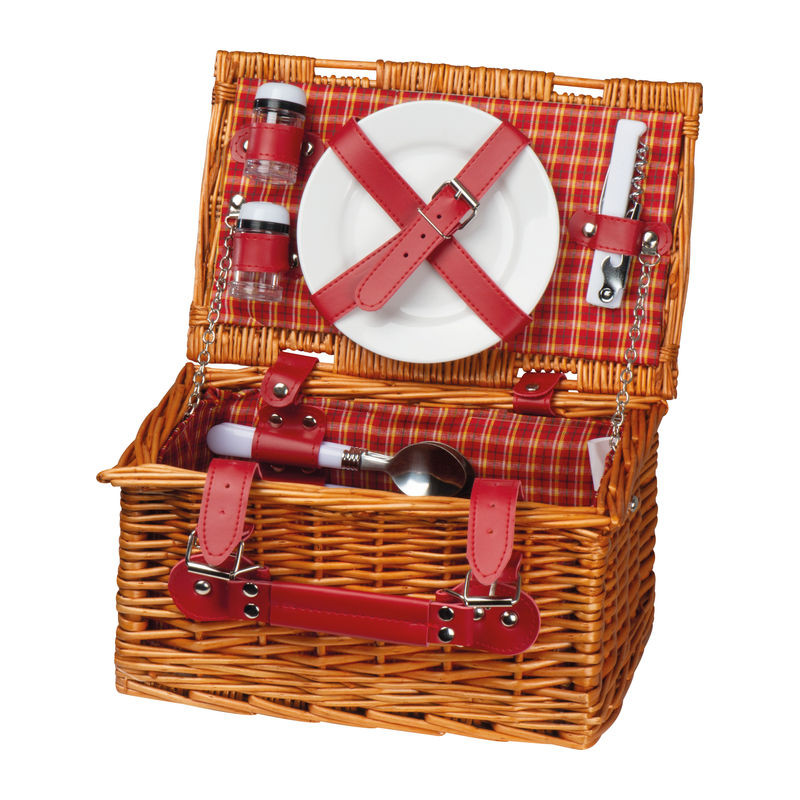 Kétszemélyes kézi piknik kosár. Tartalmaz 6 darabos evőeszközt, pincérkést, só- és bors szórókat, valamint két porcelán tányért. Az emblémázás a kosárhoz külön megvásárolható, 90868 cikkszámú fém bilétával lehetséges.