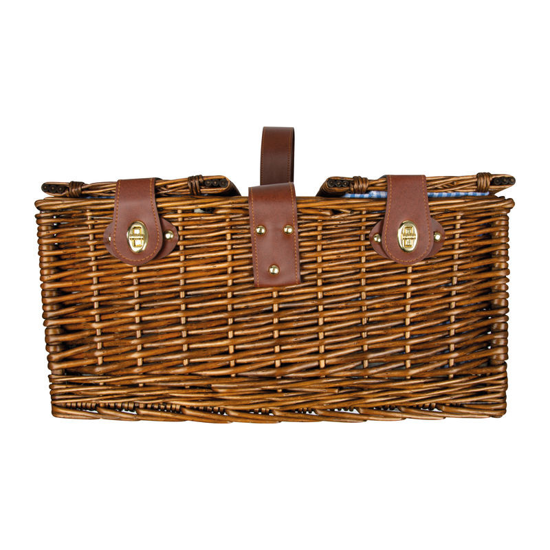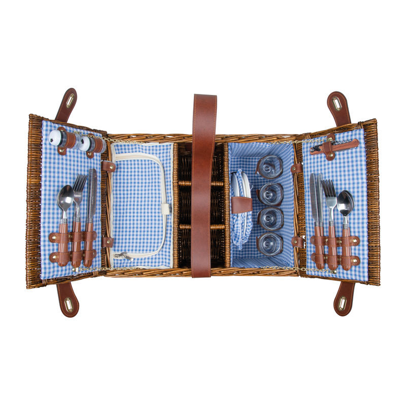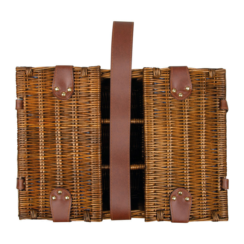 4 személyes piknik rattan kosár. A kosár tartalma: 4 pohár, 4 porcelán tányér, 4 textil szalvéta, 12 részes evőeszköz készlet, só- és borsszóró, 3 rekesz italnak, pincér kés, beépített hűtőrekesz, és egy öv a kényelmes hordozáshoz. Az emblémázás a kosárhoz külön megvásárolható, 90868 cikkszámú fém bilétával lehetséges.