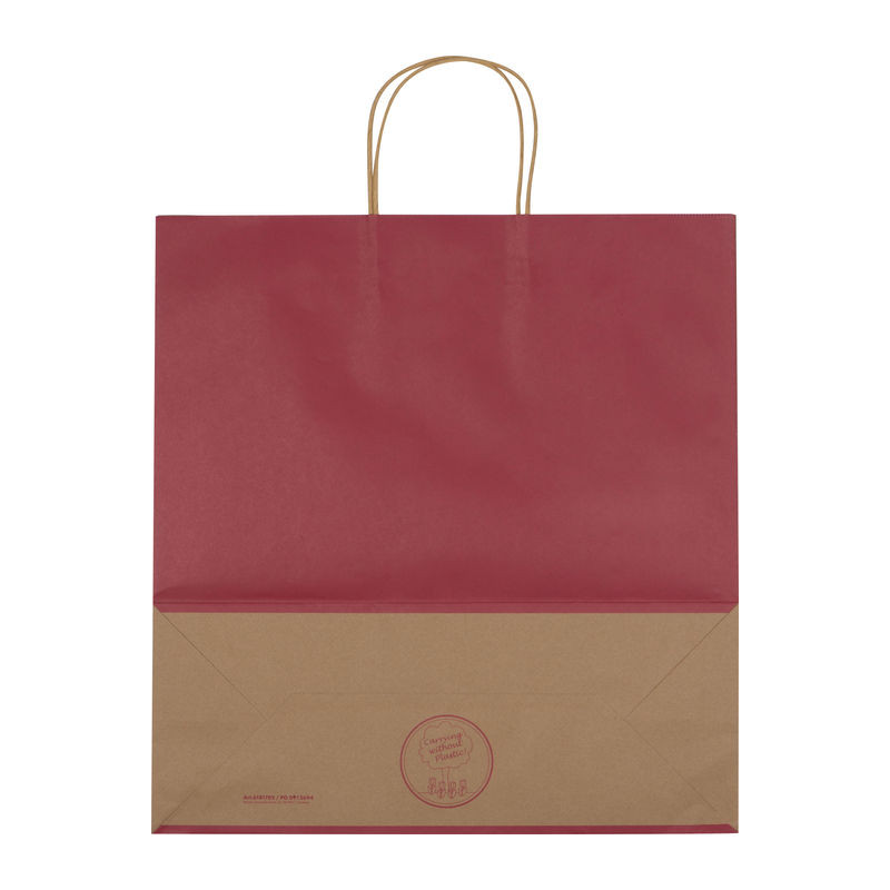 Nagyméretű, környezetbarát, újrahasznosított papírtáska (120 g / m²), alsó megerősítéssel és 2 erős fogantyúval, színes elő és hátoldallal, amit akár többször is újrahasználhat.