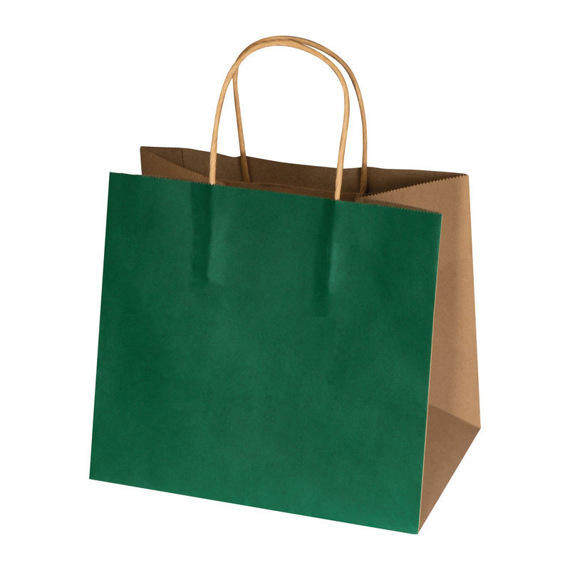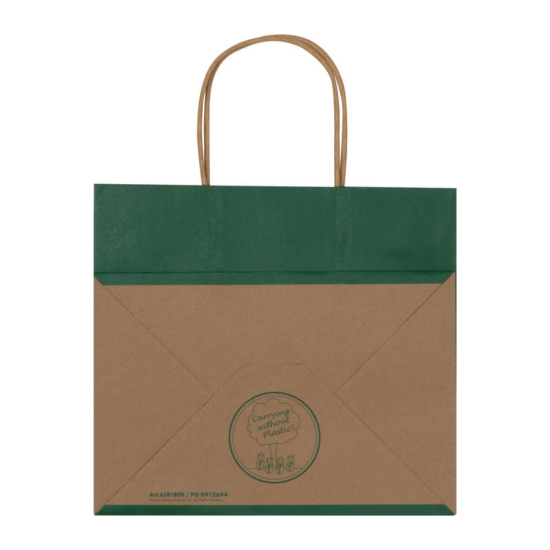 Kisméretű, környezetbarát, újrahasznosított papírtáska (120 g / m²), alsó megerősítéssel és 2 erős fogantyúval, színes elő és hátoldallal, amit akár többször is újrahasználhat.