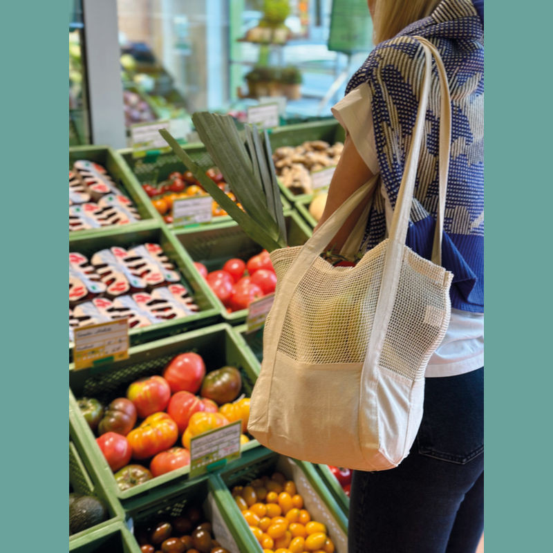 Oeko Tex Standard 100 pamut öko bevásárló -vagy strandtáska hálós középső résszel, mely a táskát rugalmassá teszi. 150 g/m²