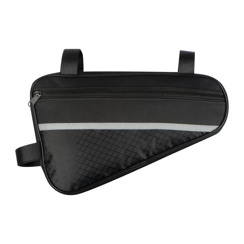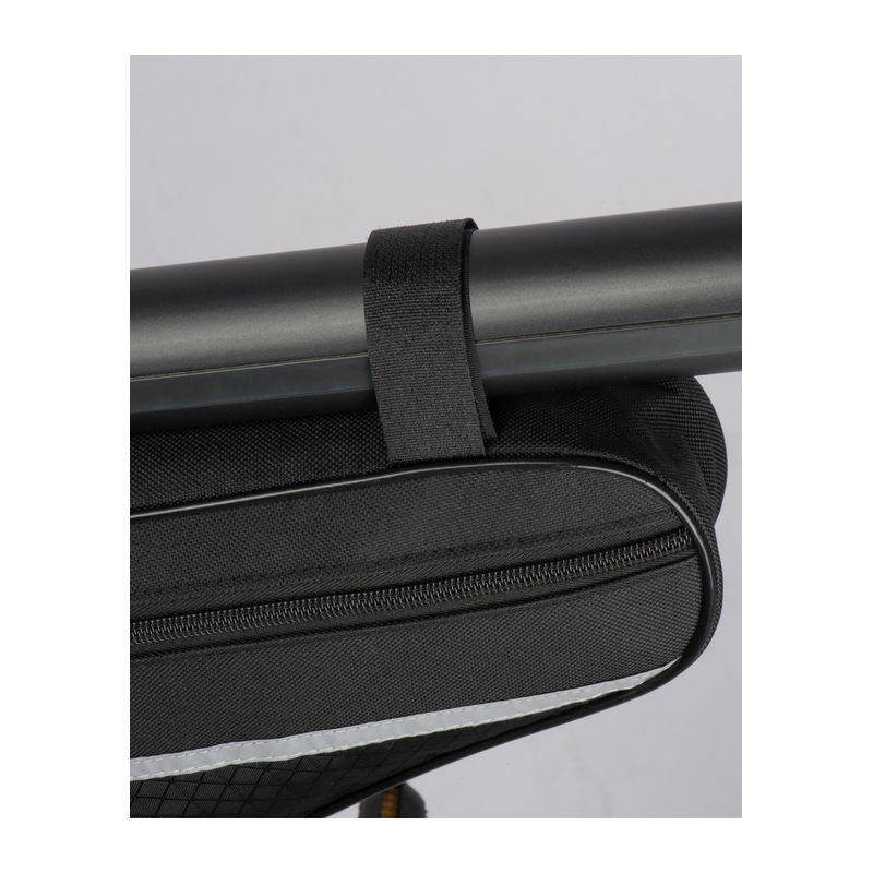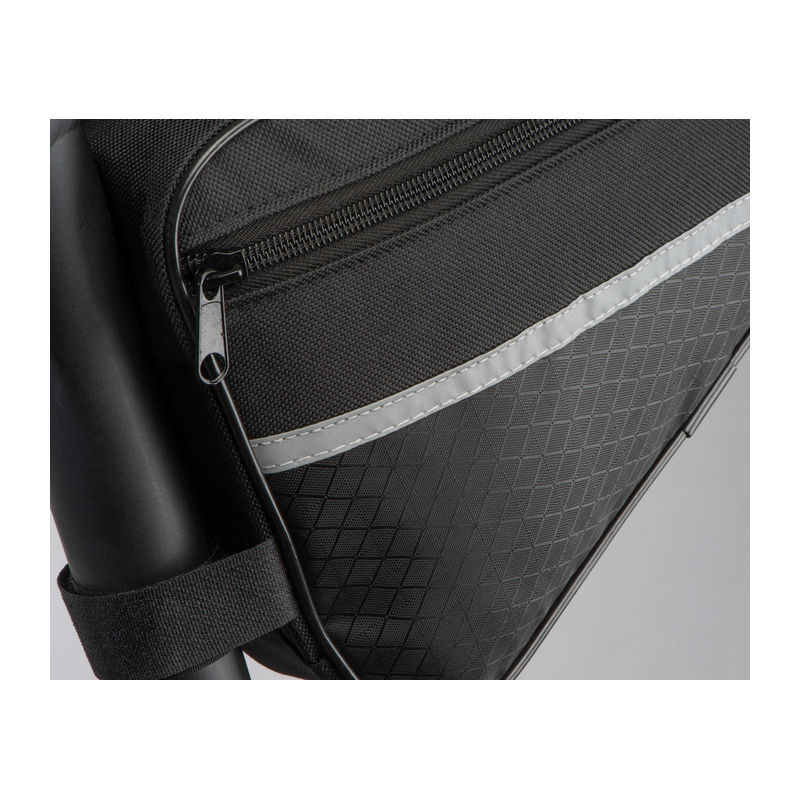 Kerékpártáska tartós 600D poliészterből, fényvisszaverő csíkokkal. A táska könnyen rögzíthető a középső váztartóra a konzolok segítségével, és elegendő helyet biztosít minden fontos tárgynak.