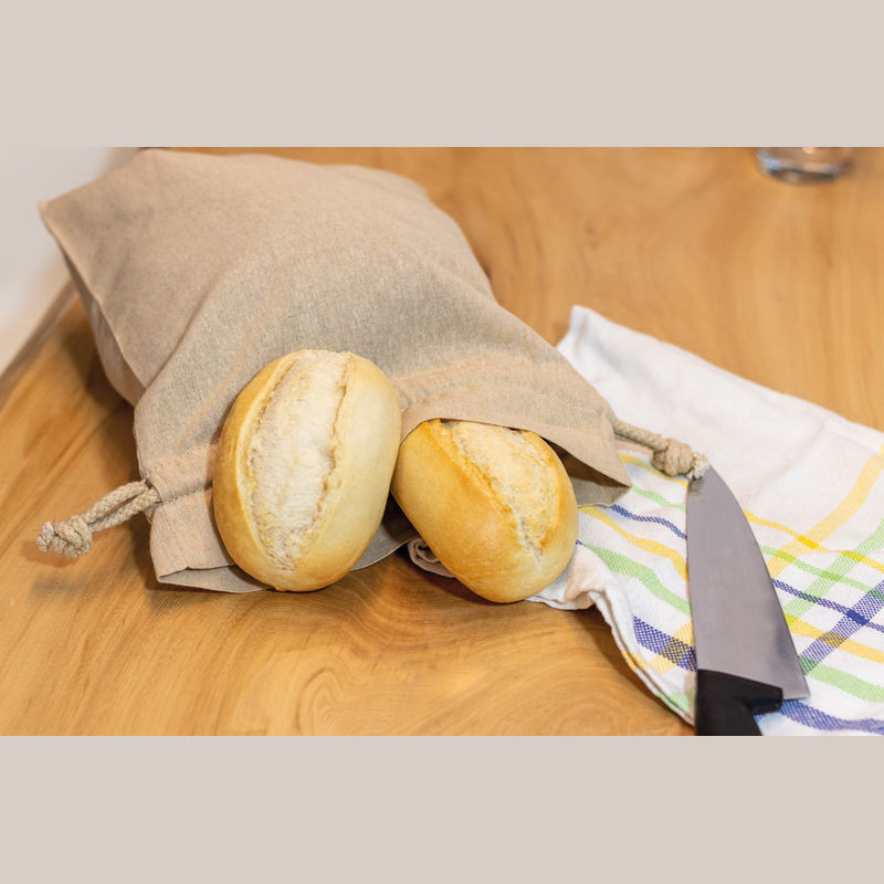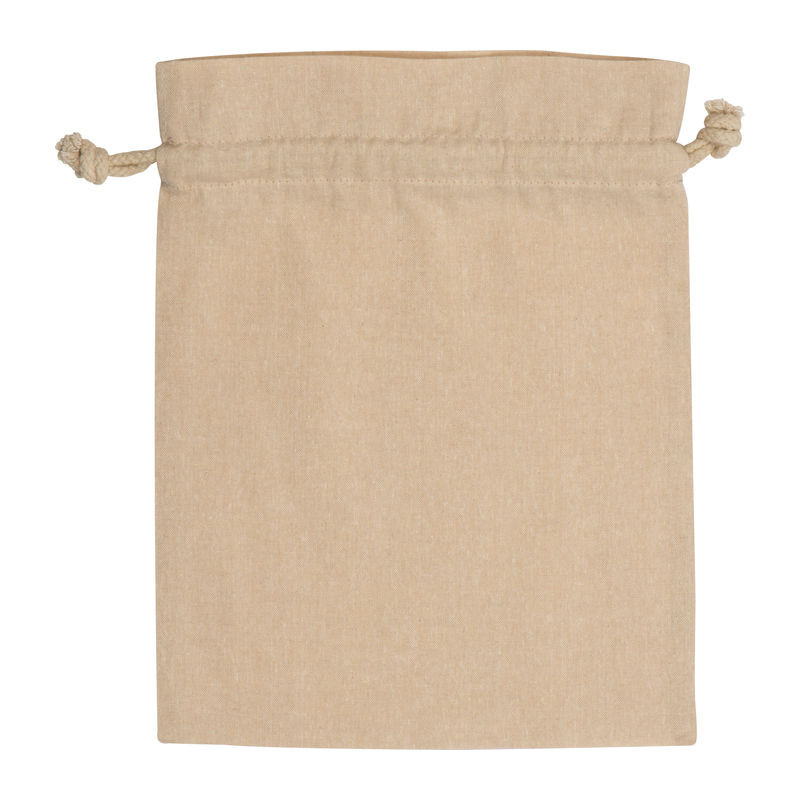 Közepes méretű Oeko-Tex® STANDARD 100 minősítésű, újrahasznosított, 110g/m² anyagvastagságú környezetbarát pamutzsák két zsinórral a zsák zárásához.