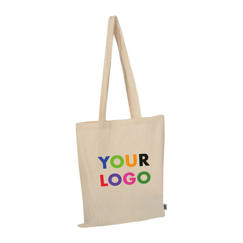 Hosszú fülű Fairtrade pamut vászontáska (140 g/m²) Fairtrade címkével.