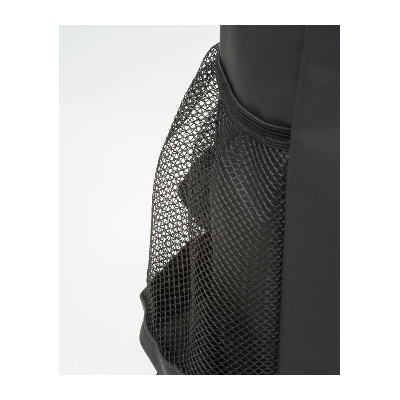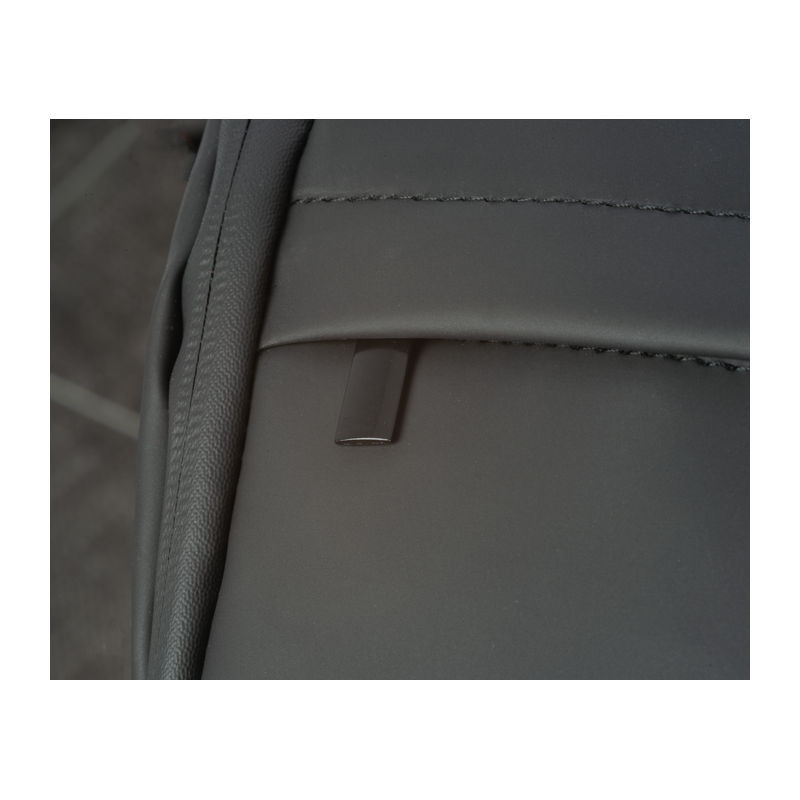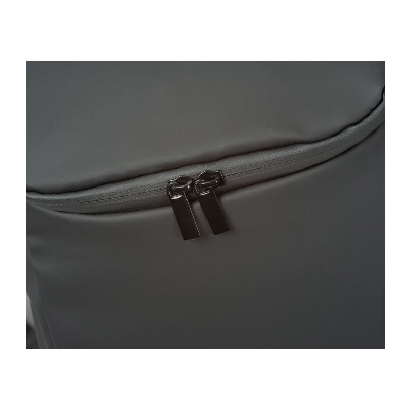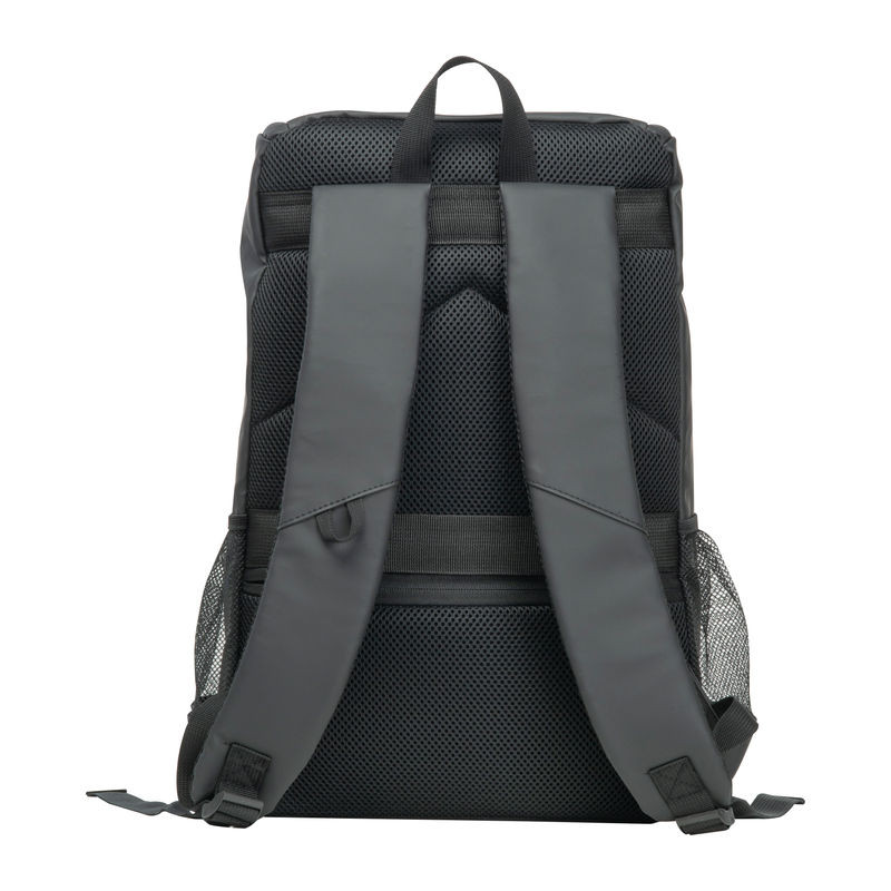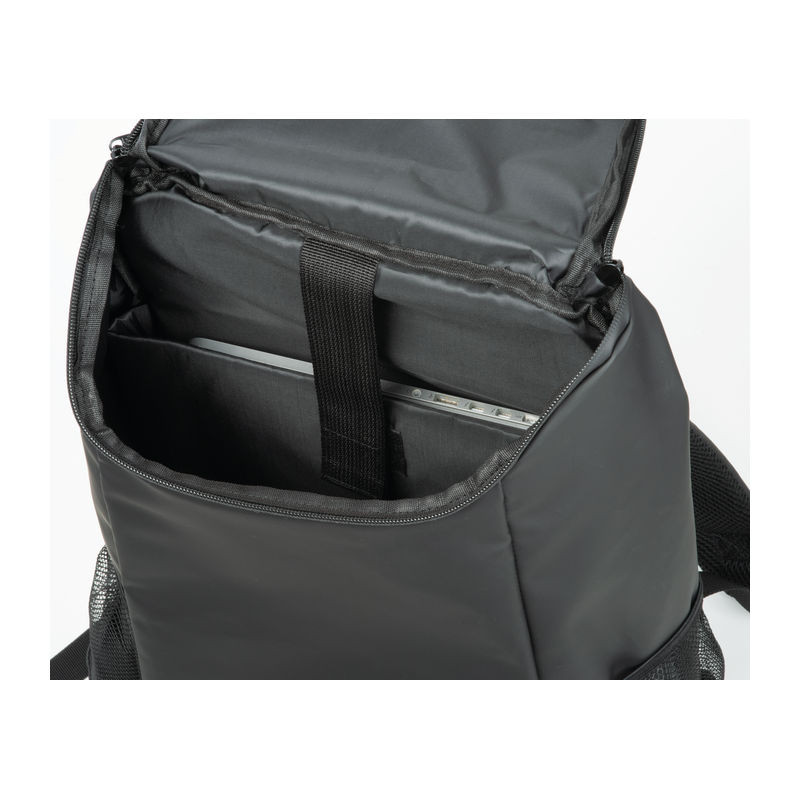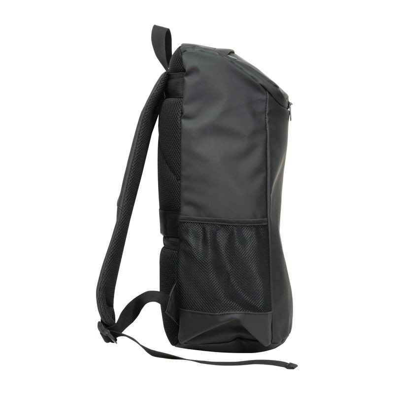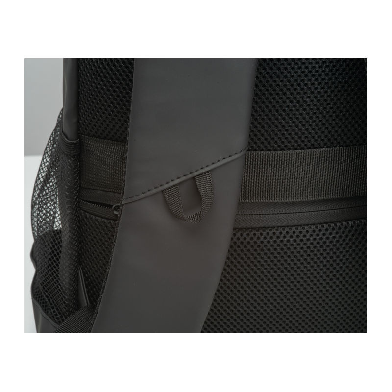 Nagyméretű műbőr hátizsák sok tárolóhellyel, belső laptop zsebbel, fényes fekete cipzárokkal, két oldalsó hálós zsebbel ital tartására, lopás elleni zsebbel és párnázott vállpántokkal.