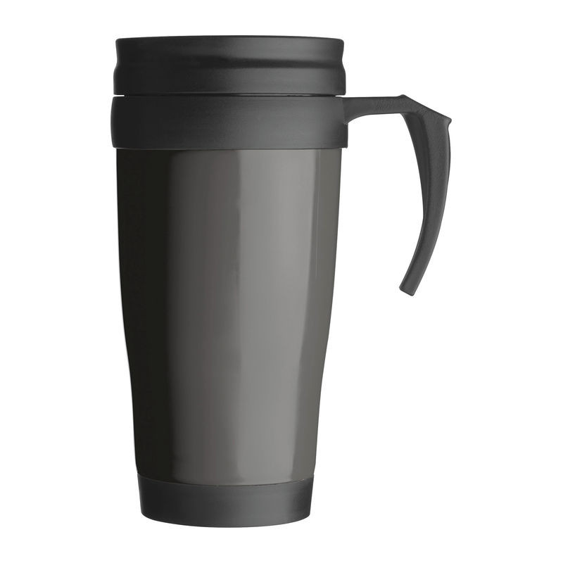 Műanyag termoszpohár 400 ml folyadék számára, zárható fedővel, fogantyúval.