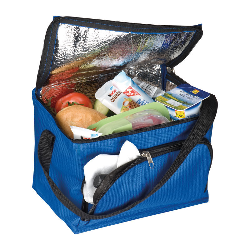 210D poliészter hűtőtáska, elején cipzáras rekesszel, vállpánttal. 6 x 0,5 literes doboz, kis üveg tárolására alkalmas, illetve bárminek, amit frissen szeretne tartani.