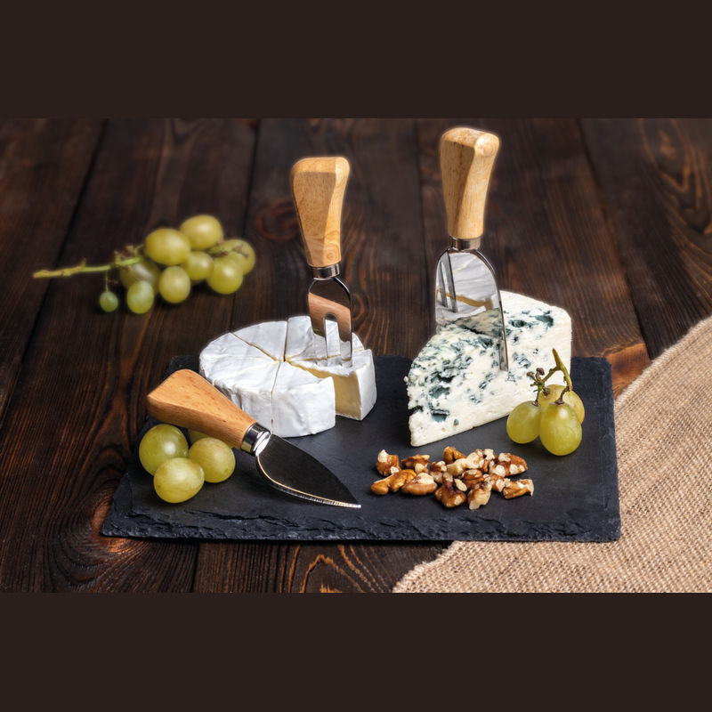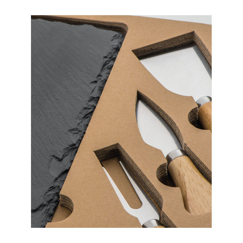 Sajtszeletelő szett erős kartondobozban, rozsdamentes acél késekkel és egy villával valamint egy pala vágódeszkával.