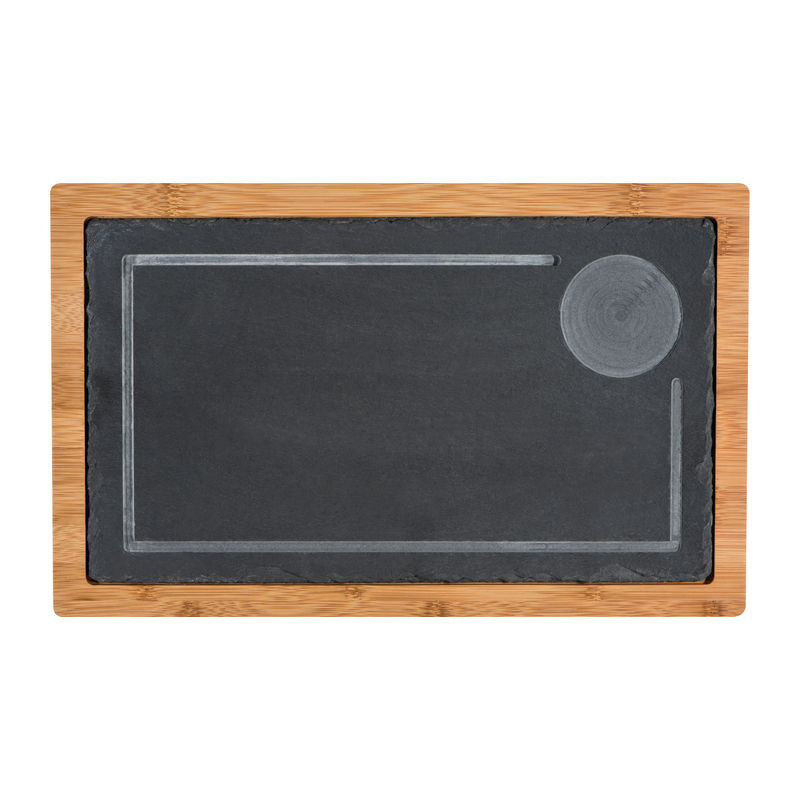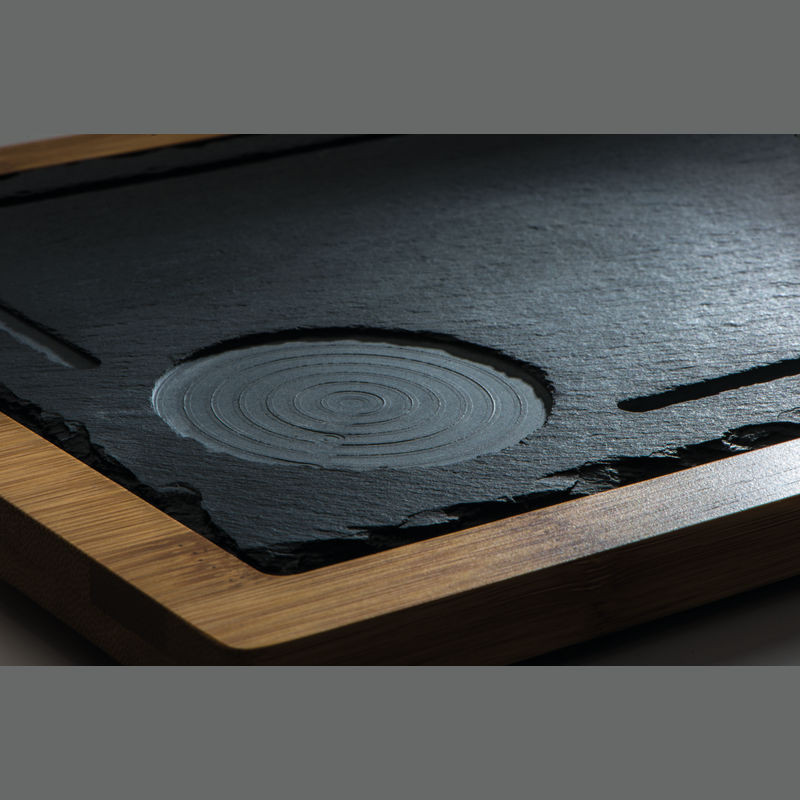 Bambuszból készült tálca palalemez betéttel, melyen van egy italtartó rész és folyadékelvezető csatorna.