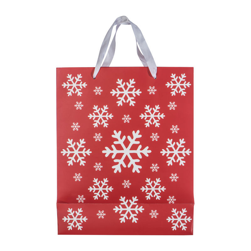 Nagy karácsonyi papírtáska, hópehely mintával és vászon fülekkel.