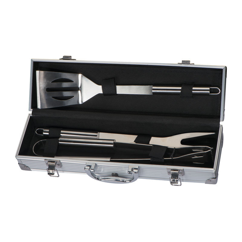 Zárható fém BBQ szett, zárpánttal és hordozó füllel. Húslapát, grillvilla és grillcsipesz tartozik a szetthez.