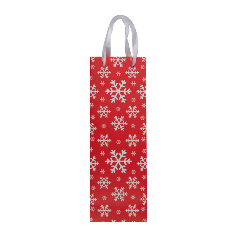 Karácsonyi papírtáska hópehely mintával és két vászon füllel. Alkalmas bor vagy pezsgősüveg számára.