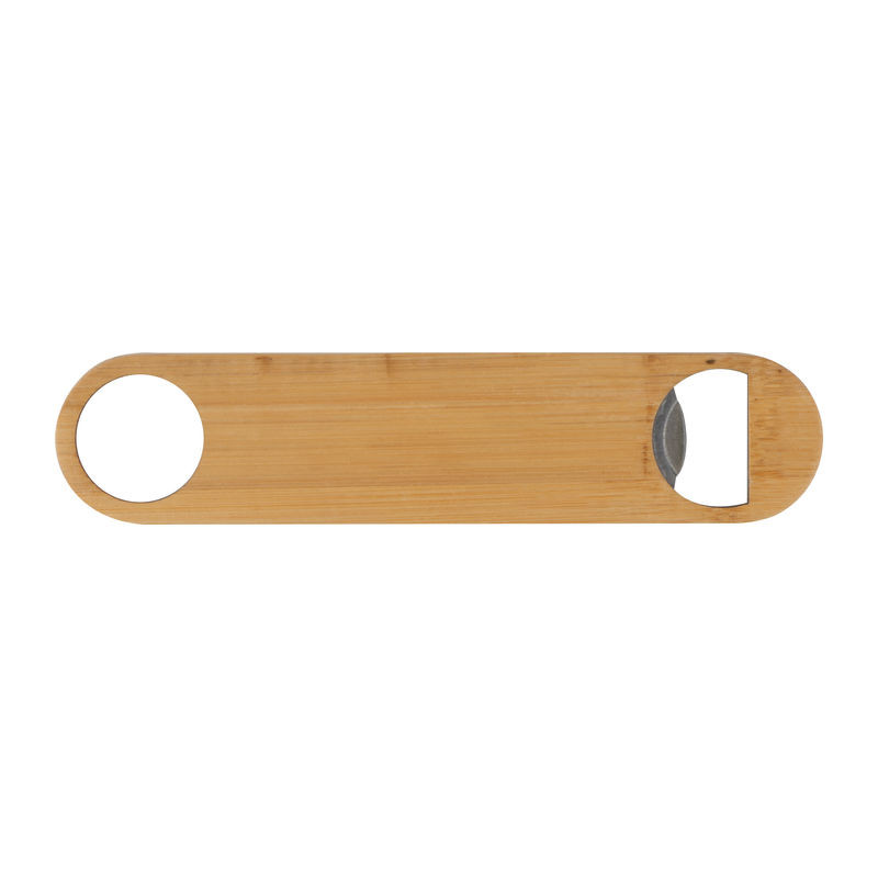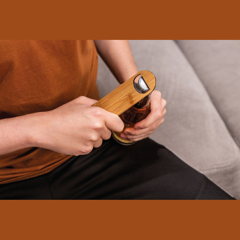 Nagy sörnyitó, egyik oldalán bambusz bevonattal, másik oldalán rozsdamentes acél kidolgozással.