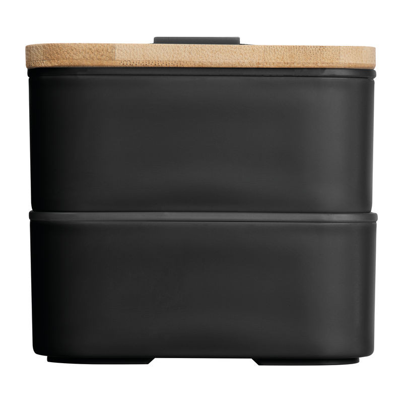 Kétszintes ételtartó és uzsonnás doboz két külön rekesszel, egy bambusz fedéllel. Leválasztó, kés és villa, valamint gumiszalaggal a záráshoz.