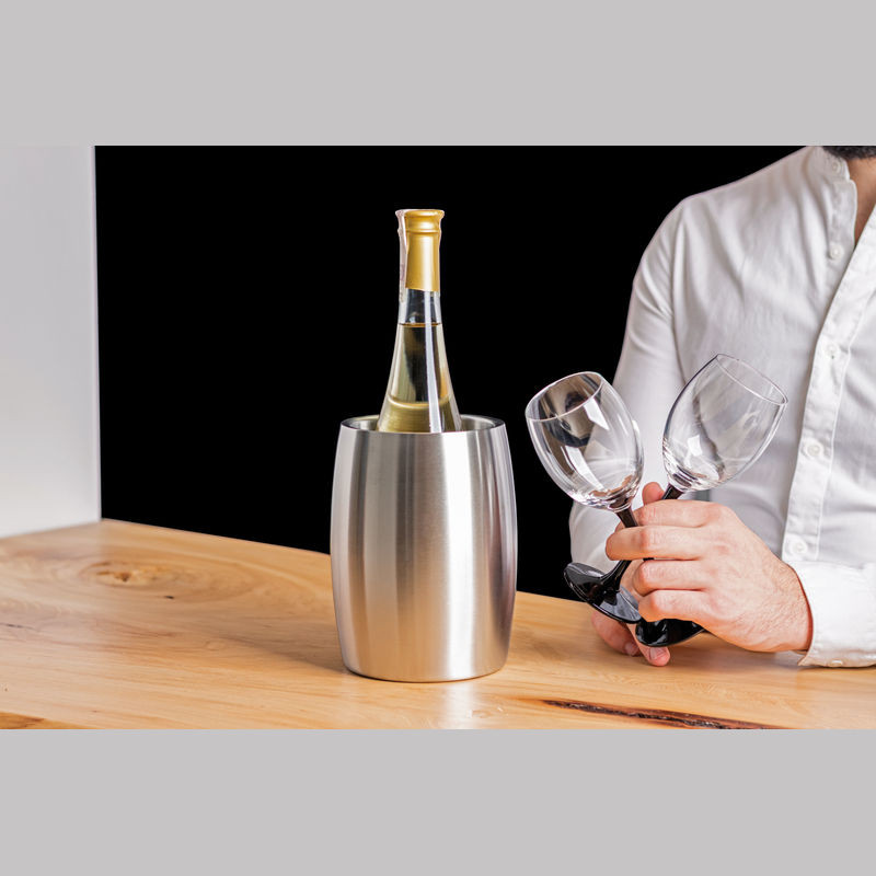 Kiváló minőségű rozsdamentes acélból készült duplafalú üveghűtő. Hosszú ideig hidegen tartja a bort jégkockák nélkül is. Bármely népszerű üveg mérethez megfelelő.
