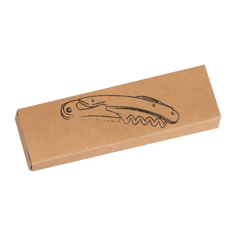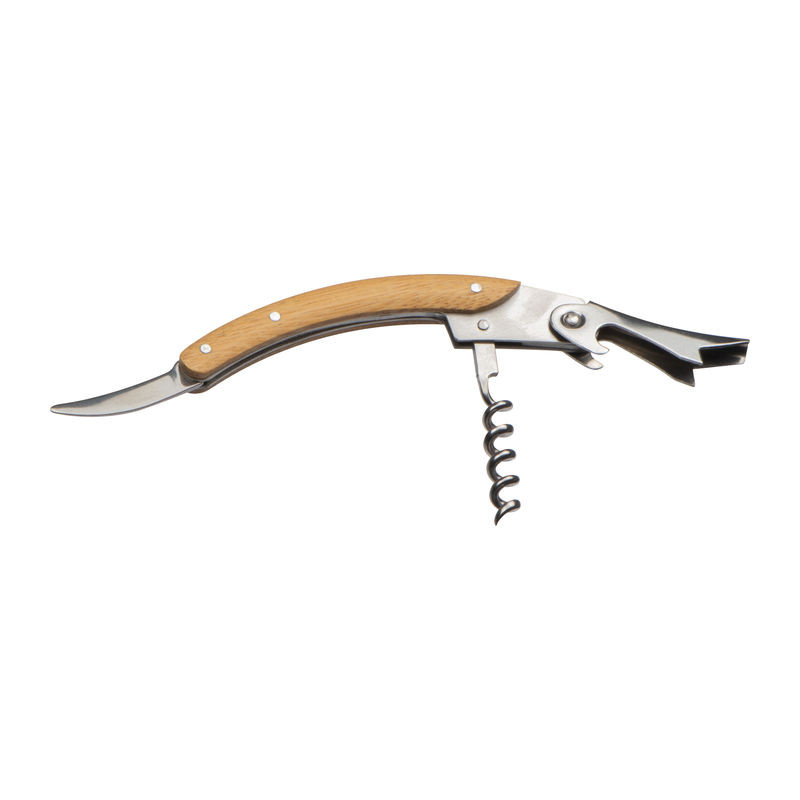 Fémből készült bambusz markolatú pincérkés sörnyitóval, fóliavágóval és dugóhúzóval.