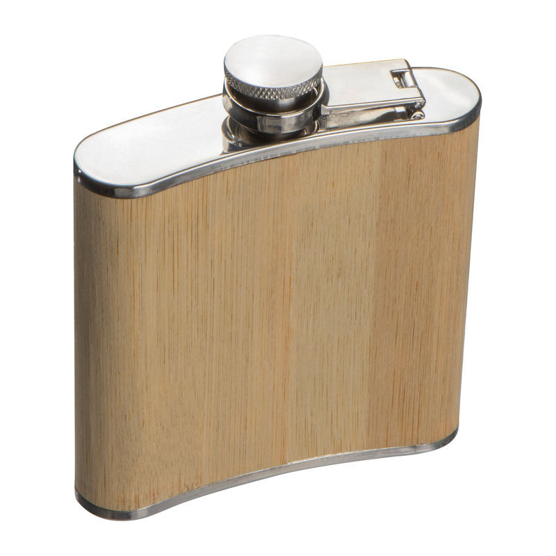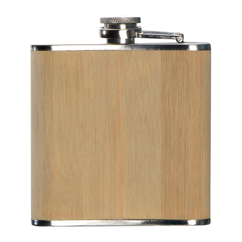 170 ml űrtartalmú rozsdamentes acél laposüveg bambusz bevonattal, biztonsági csavarómechanikus zárral rendelkezik.