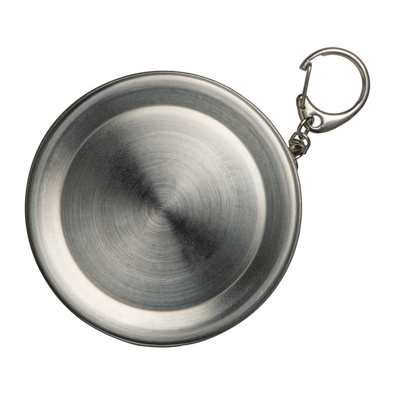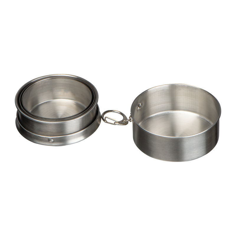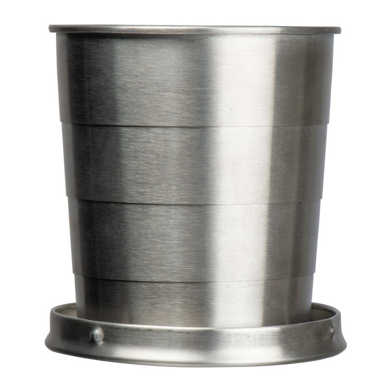 Összecsukható rozsdamentes acél ivópohár 250 ml űrtartalommal. Helytakarékosan tárolható és karabinerrel ellátott integrált fémdobozban, ideális minden szabadtéri tevékenységhez vagy utazáshoz.