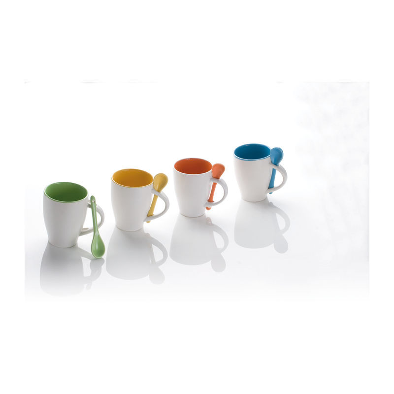 Kerámia bögre kanállal, vidám színekben 250 ml űrtartalommal. Reggeli kávézáshoz, hogy jókedvűen induljon a nap!