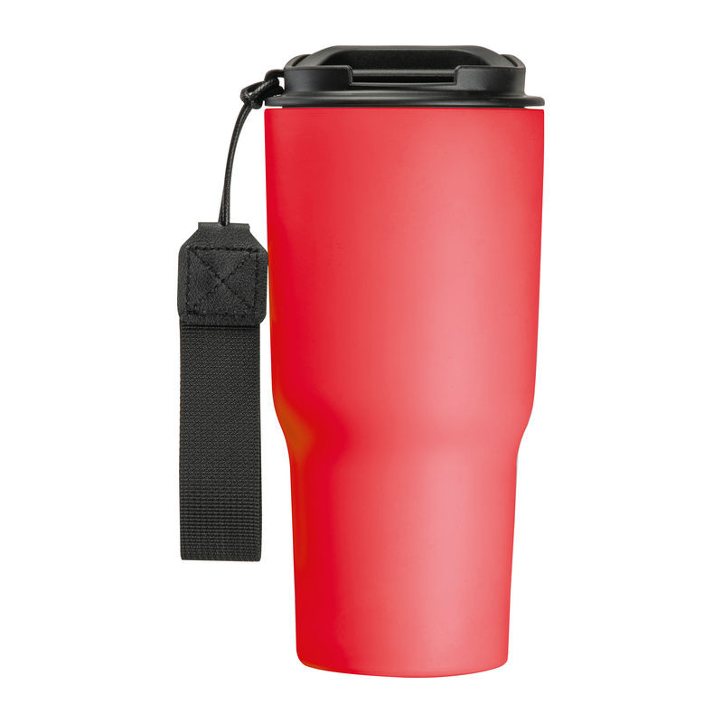 Elegáns dupla falú vákuumos termosz pohár rozsdamentes acélból, 550 ml-es kapacitással, szivárgásmentes csavarmenetes kupakkal és praktikus hordozó pánttal.