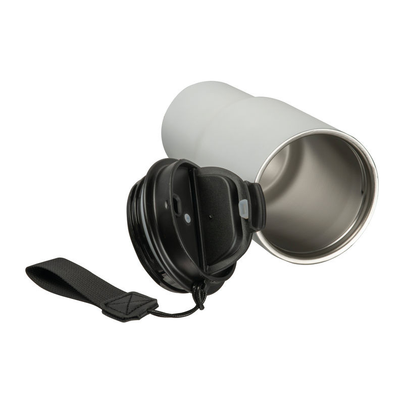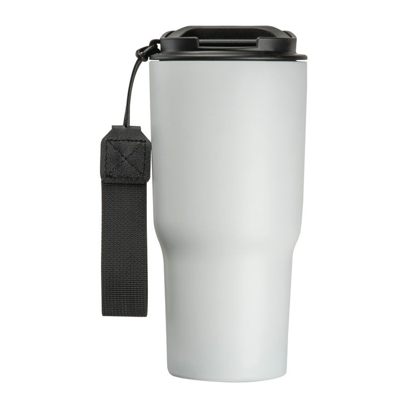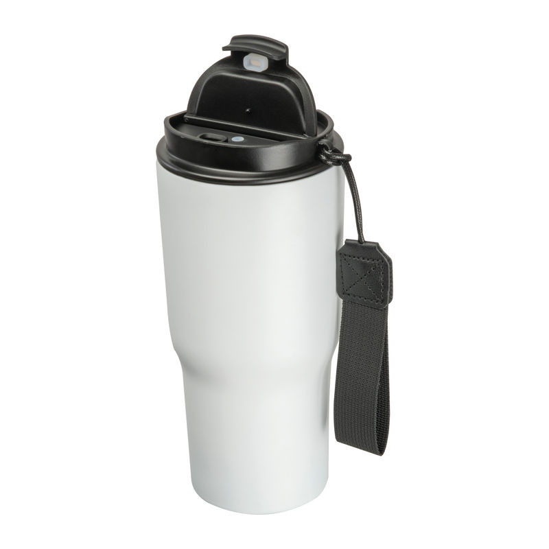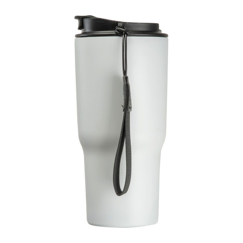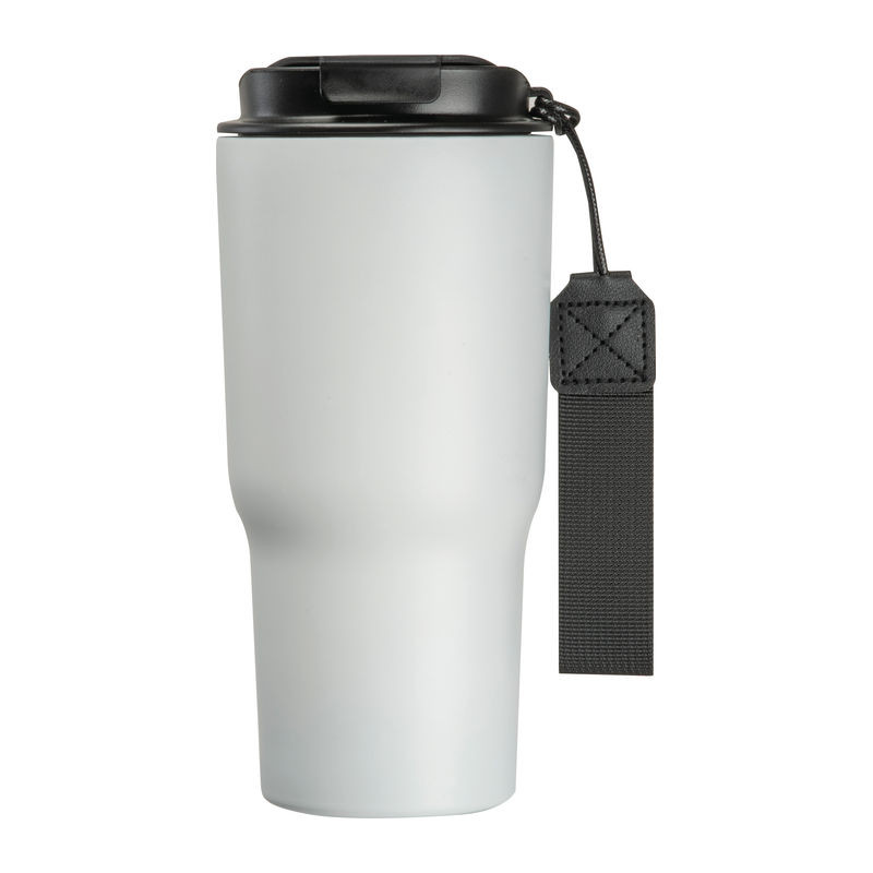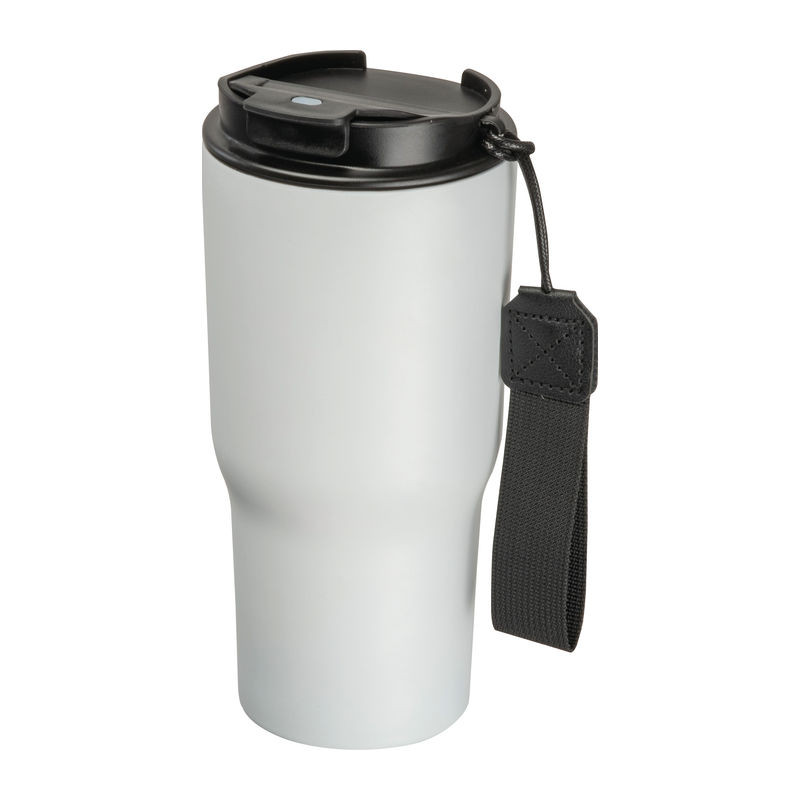 Elegáns dupla falú vákuumos termosz pohár rozsdamentes acélból, 550 ml-es kapacitással, szivárgásmentes csavarmenetes kupakkal és praktikus hordozó pánttal.