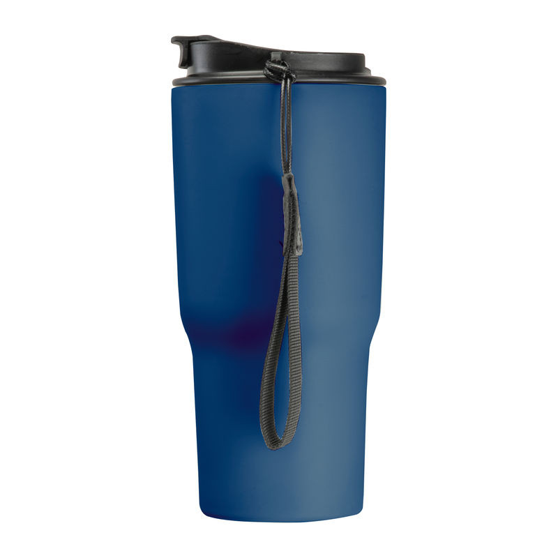 Elegáns dupla falú vákuumos termosz pohár rozsdamentes acélból, 550 ml-es kapacitással, szivárgásmentes csavarmenetes kupakkal és praktikus hordozó pánttal.