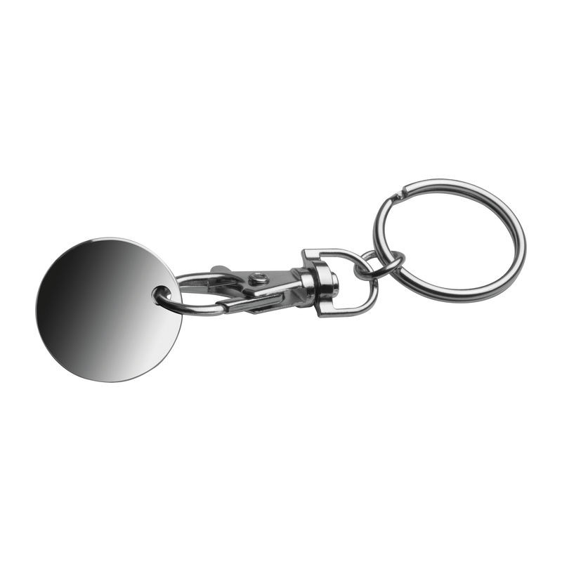 Kulcstartó egy karabinerről levehető bevásárlókocsi érmével. Az érme egyik oldala tökéletes hely a logó számára.