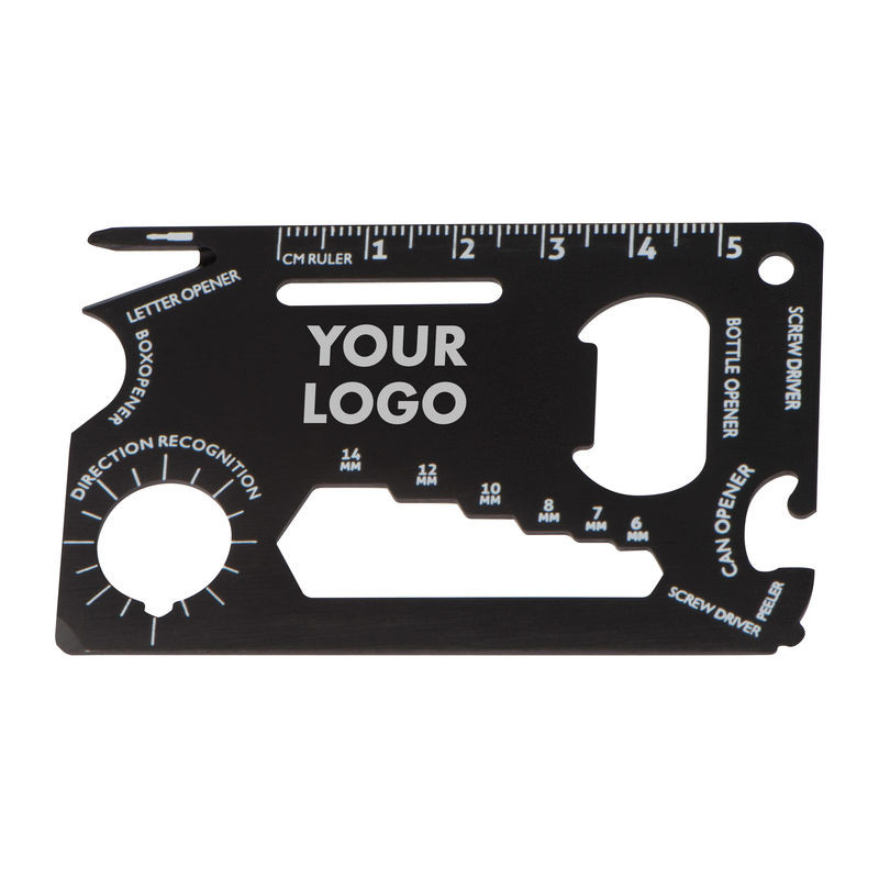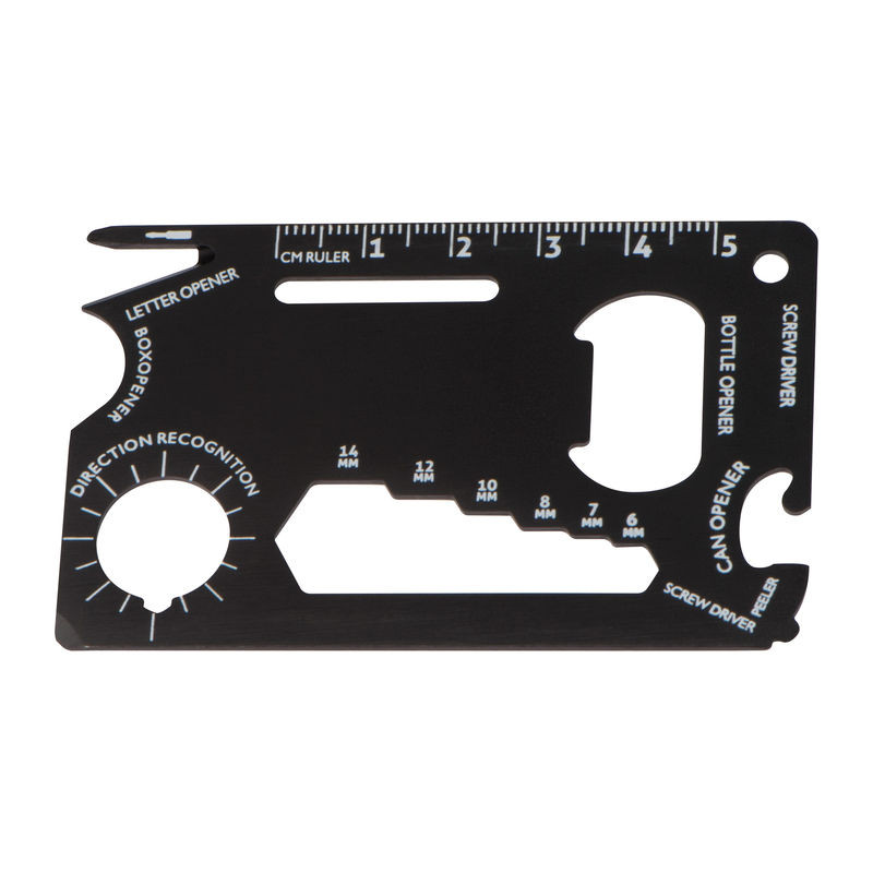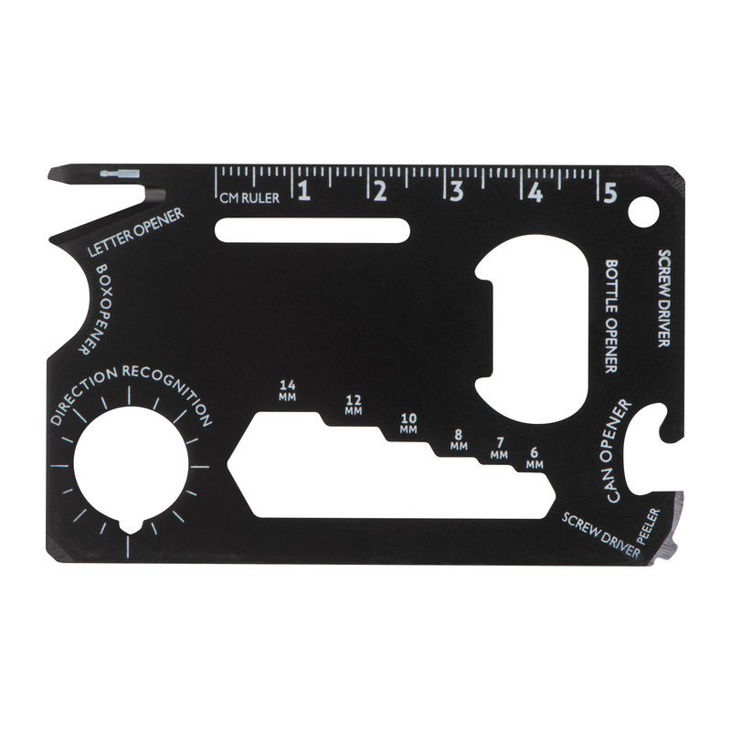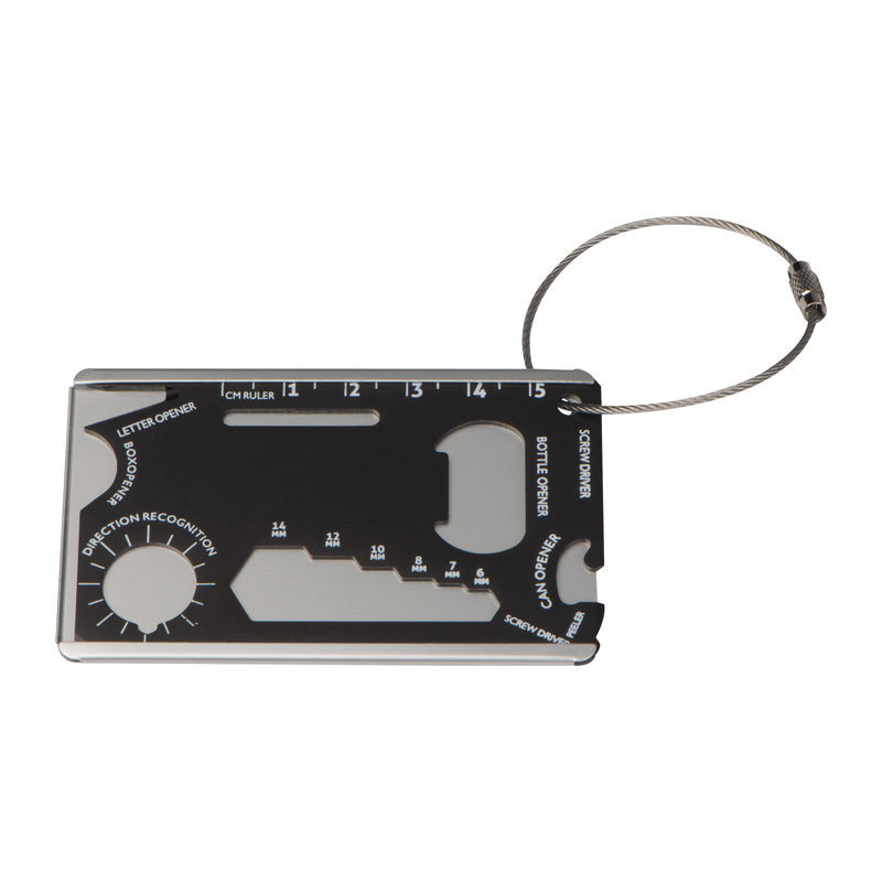 Túlélő bőröndcímke vagy biciklis szerszám alumíniumból. Funkciói: papírkés, vonalzó, üveg- és konzervnyitó, csavarhúzó, iránytű, csavarkulcs és hámozó.