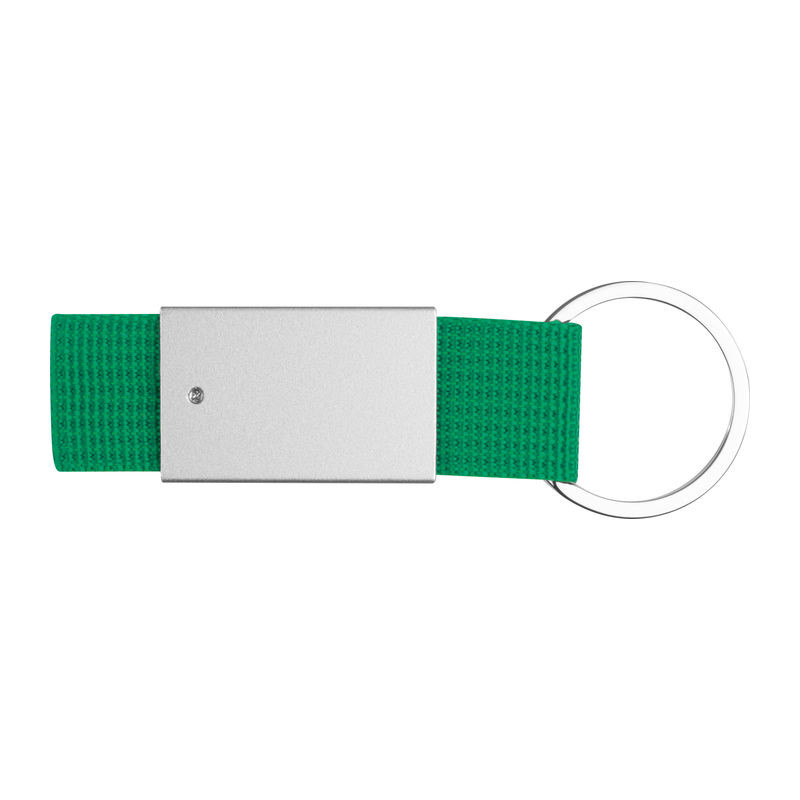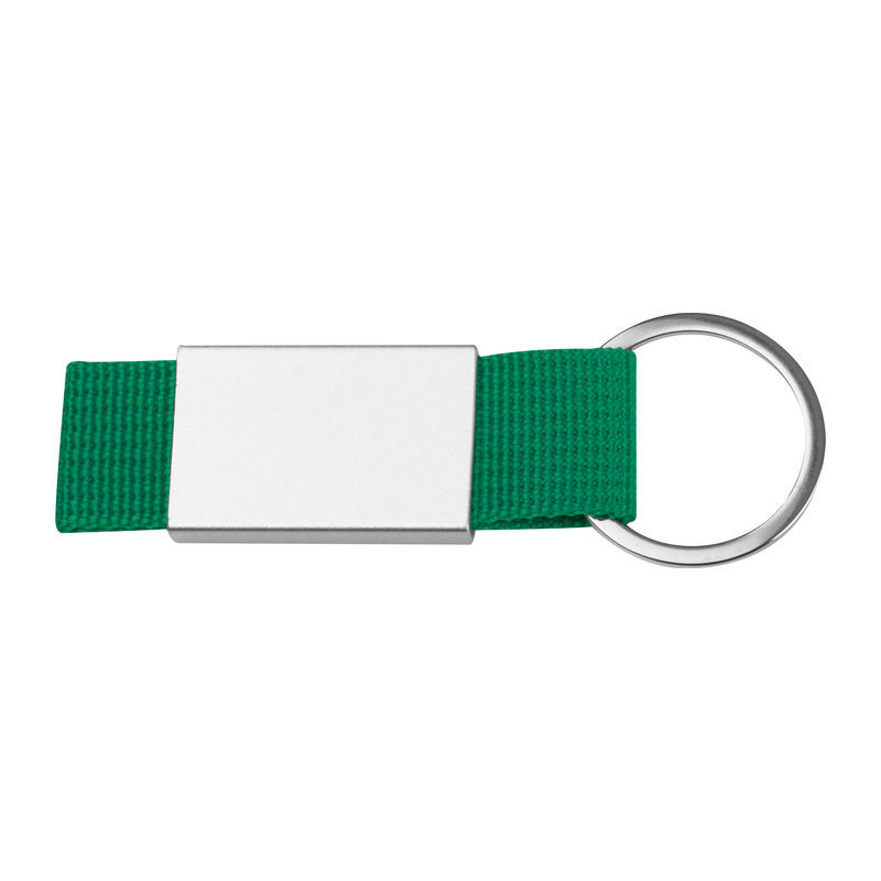 Kulcstartó színes textil szalaggal és fényes fémlemezzel, különböző színekben.