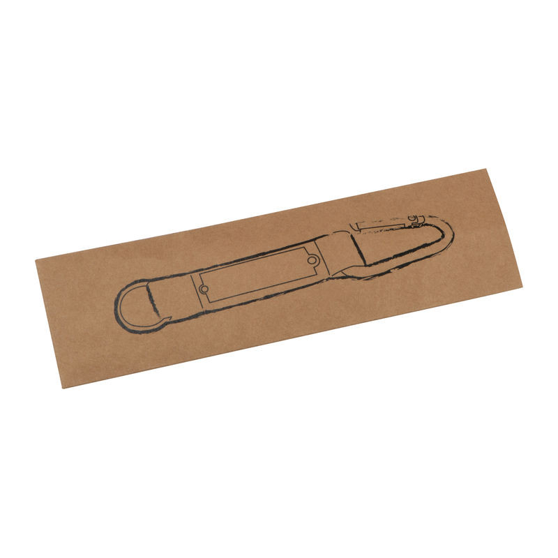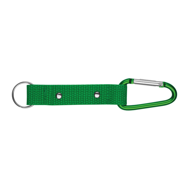 Kulcstartó szövet szíjjal, karabinerrel és szegecselt fém lapocskával a lézergravírozáshoz.