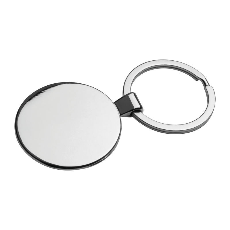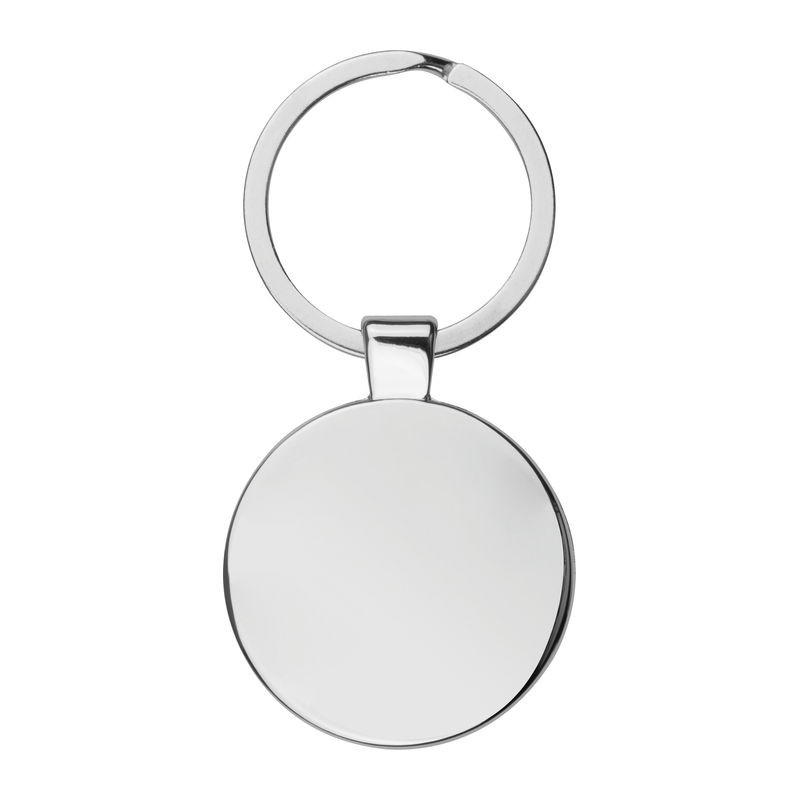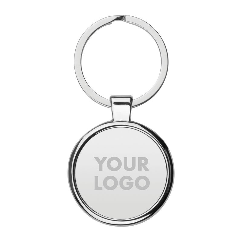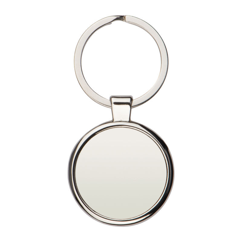 Kör formájú elegáns fém kulcstartó, fényes keretben, matt króm, jól emblémázható felülettel, környezetbarát csomagolásban.