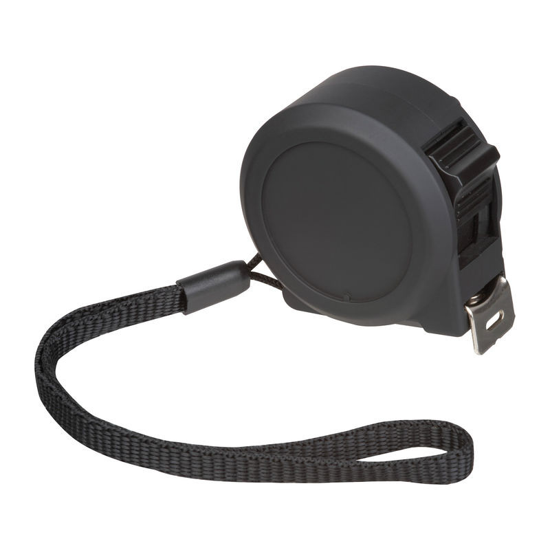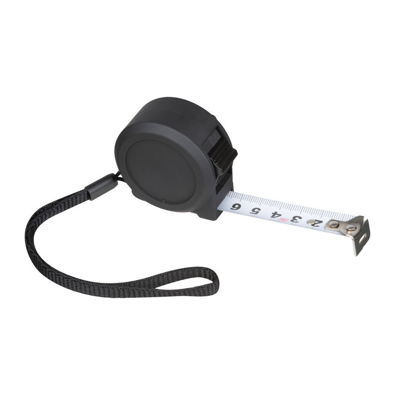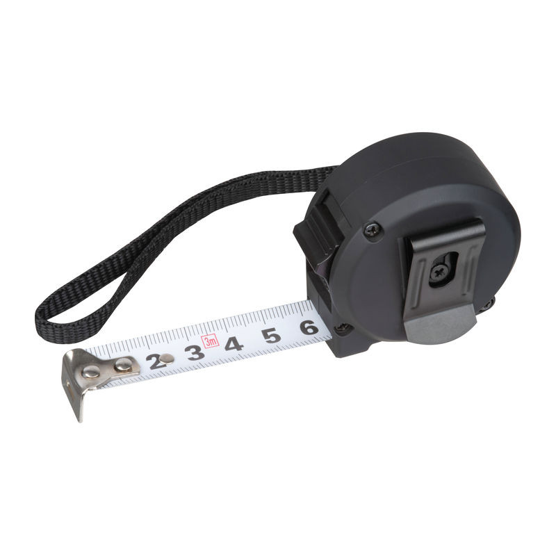 Masszív acél mérőszalag, 3 m-es hosszúsággal, robusztus műanyag házban, nagy számokkal, állandó rögzítővel és praktikus nejlon kézszíjjal.