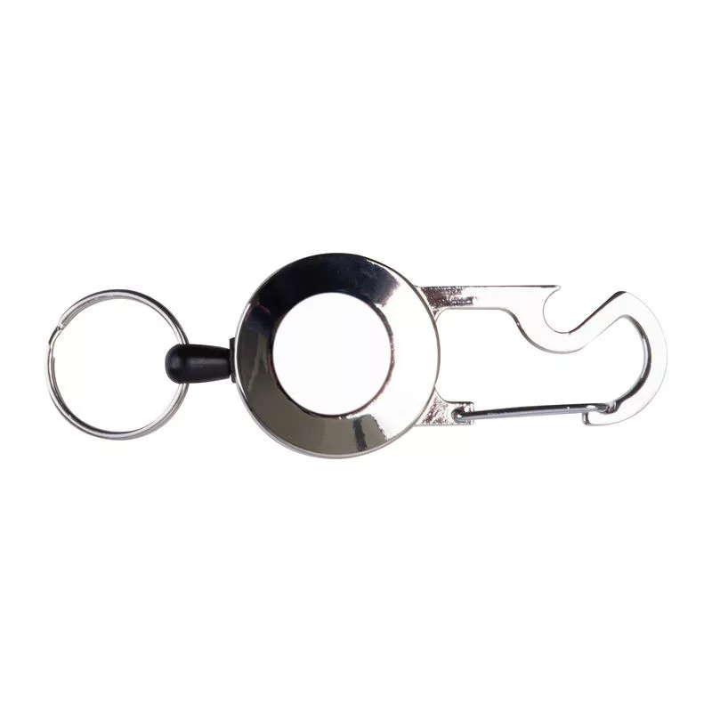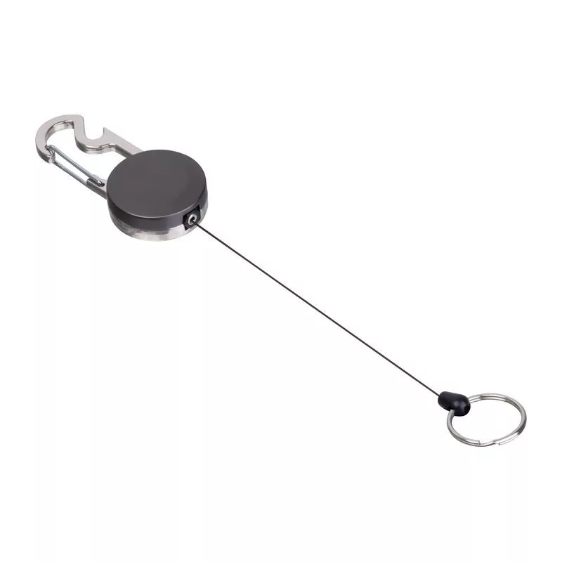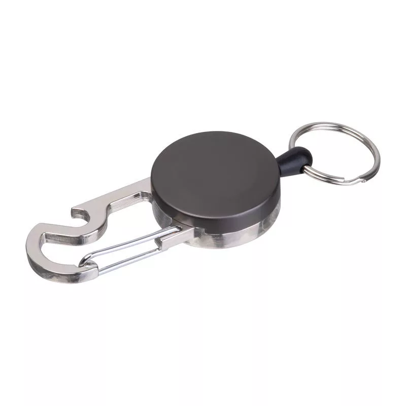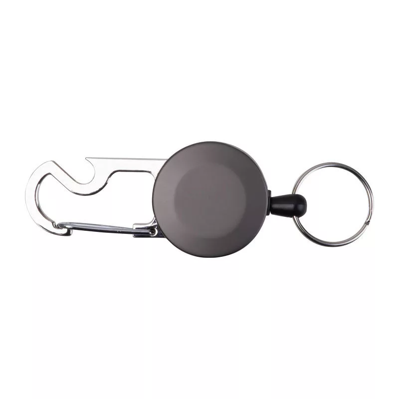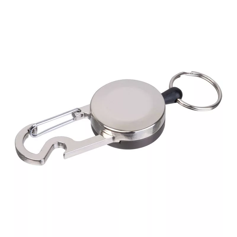Kihúzható fém kulcstartó kártyatartóval és karabinerrel, üvegnyitóval. A kulcskarika 55 cm-ig nyújtható, behúzható zsinórral.
