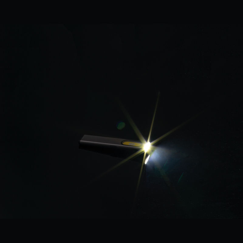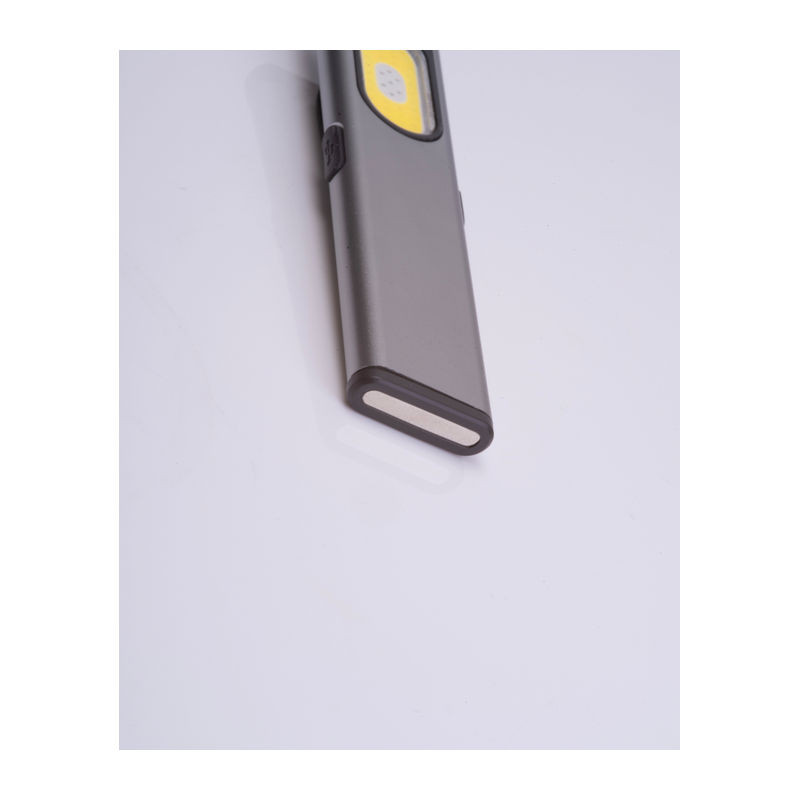 Újratölthető elemlámpa (450 mAh) újrahasznosított alumíniumból, oldalsó COB világítással (160 lumen) és elülső világítással (80 lumen), csipesszel és mágneses véggel. Tartalmaz töltőkábelt.