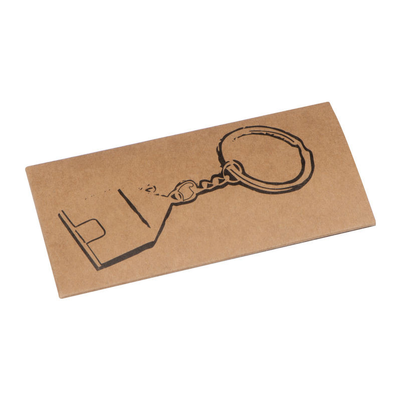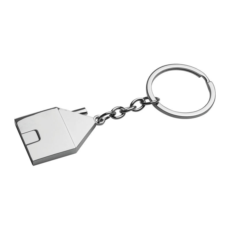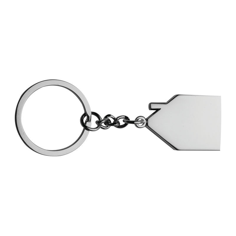 Ház formájú fém kulcstartó, kulcs karikával és lánccal.