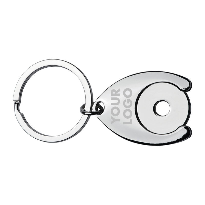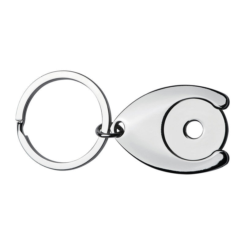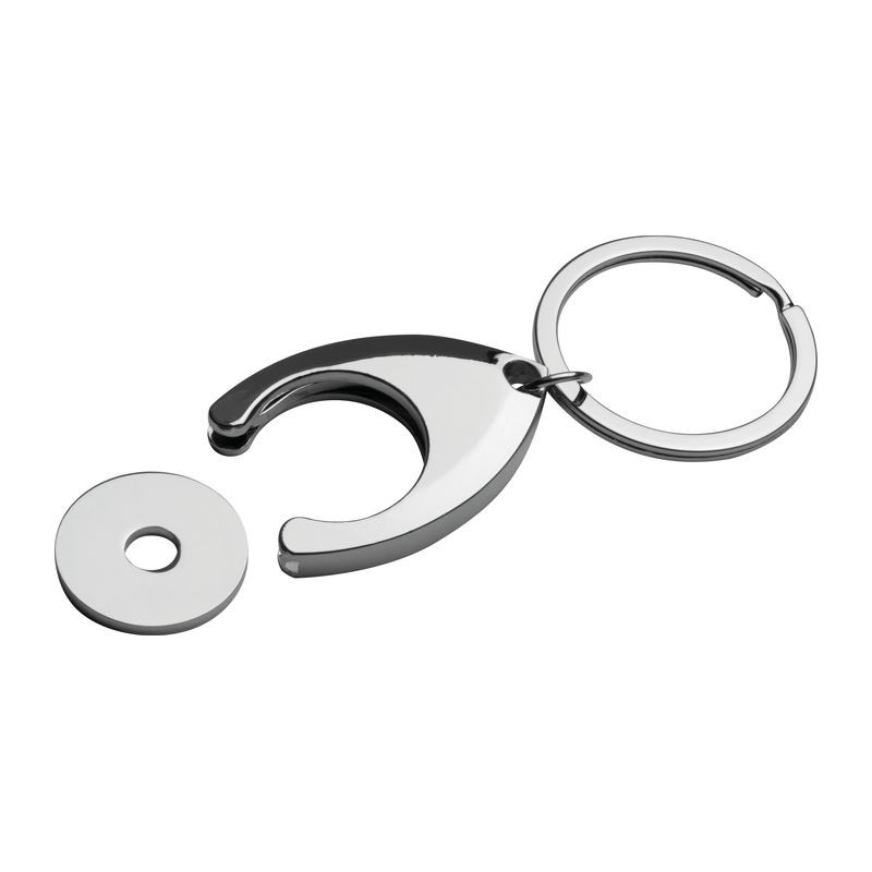 Fényes kivitelű fém kulcstartó, bevásárlókocsi érmével.