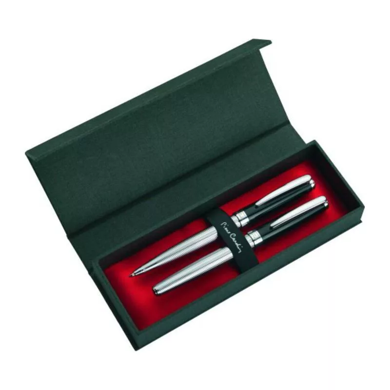 Pierre Cardin fém golyóstoll és töltőtoll szett vaskos kivitelben. A fehér és fekete gravír kombinációja egyedi díszítést ad a tollnak. A díszdoboz fekete pótbetétet tartalmaz. Pierre Cardin díszdobozban, hitelességi bizonyítvánnyal szállítjuk.