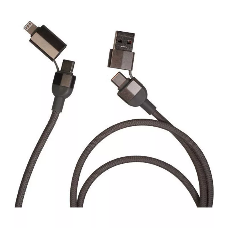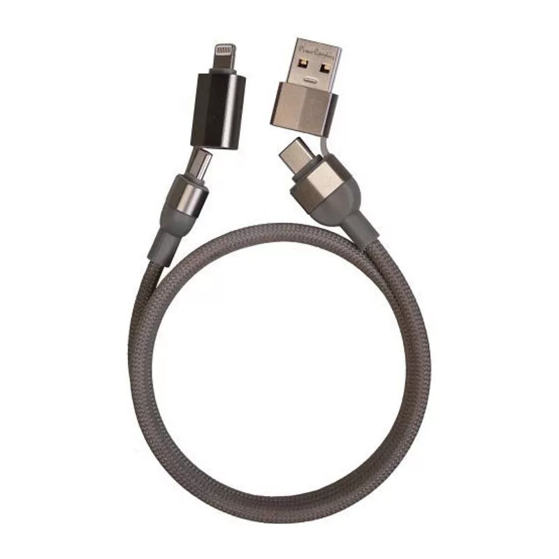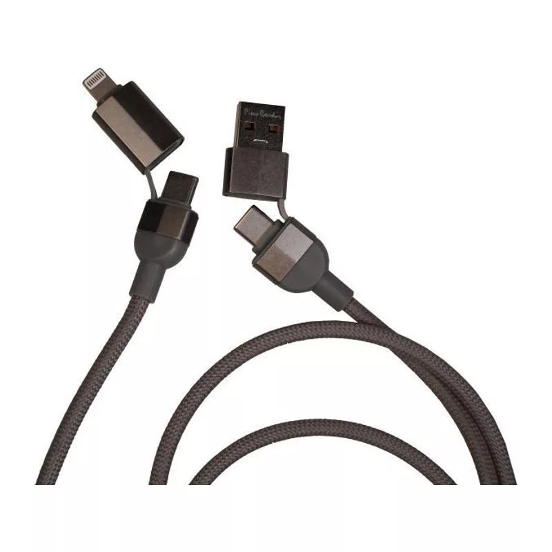 Pierre Cardin mágneses 100 W-os gyorstöltésre és adatátvitelre alkalmas kábel. A kábel alumíniumból készült, nejlonfonattal borított, és a mágnes révén mindig gondosan összehajtva marad. Kábelcsatlakozók: bemenet USB-A, USB-C; kimenet USB-C, Lightning. A kábel hossza 100 cm. Díszdobozban, eredetiségi tanúsítvánnyal együtt.