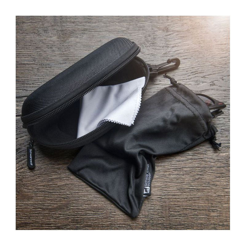 Schwarzwolf kemény tok napszemüveghez, fekete vászonból és bársony anyagból készült, a cipzáron Schwarzwolf logóval. A tok egy fekete mikroszálas tasakot és egy szublimációra alkalmas fehér mikroszálas tisztítókendőt tartalmaz. Díszdobozba csomagolva.