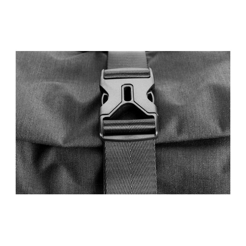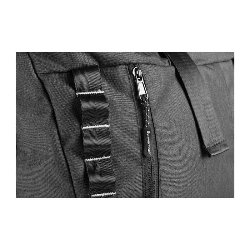 Fekete rolltop Schwarzwolf hátizsák, amely turizmusra és mindennapi használatra egyaránt alkalmas. A hátizsákot fekete csíkok díszítik, szürke szegéssel. Van egy fő belső rekesz egy különálló zsebbel és egy kis kiegészítő zsebbel, egy kis elülső cipzáros zsebbel, két oldalsó hálós zsebbel és egy kis hátsó cipzáras zsebbel. Tekerés után műanyag csattal rögzíthető. A hátizsák párnázott hát- és vállpánttal rendelkezik. Űrtartalom: tekert hátizsák 25 l, összecsukott hátizsák 32 l.