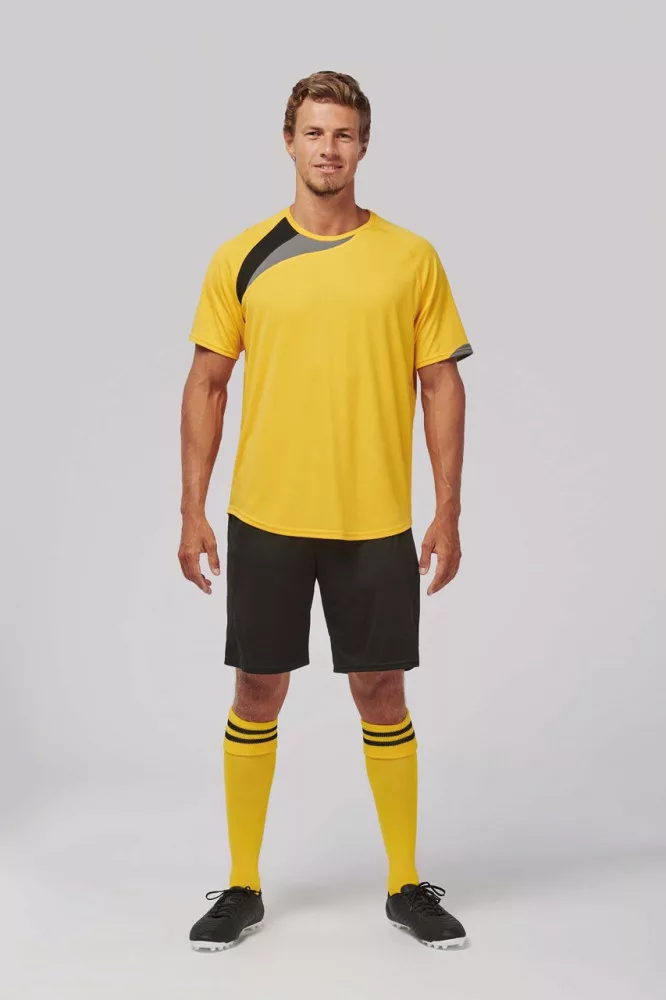 100% poliészter Raglánujjas fazon Gyorsan száradó anyag Kontrasztos panelek Duplatűzött szegések