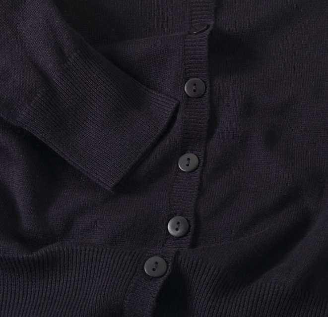 Fabric 55% Cotton 45% Acrylic 12 Gauge Knit Features Cotton rich ladies’ cardigan V-neck styling Seven-button fastening Ribbed knit cuffs and hem Fine gauge knit Easy care