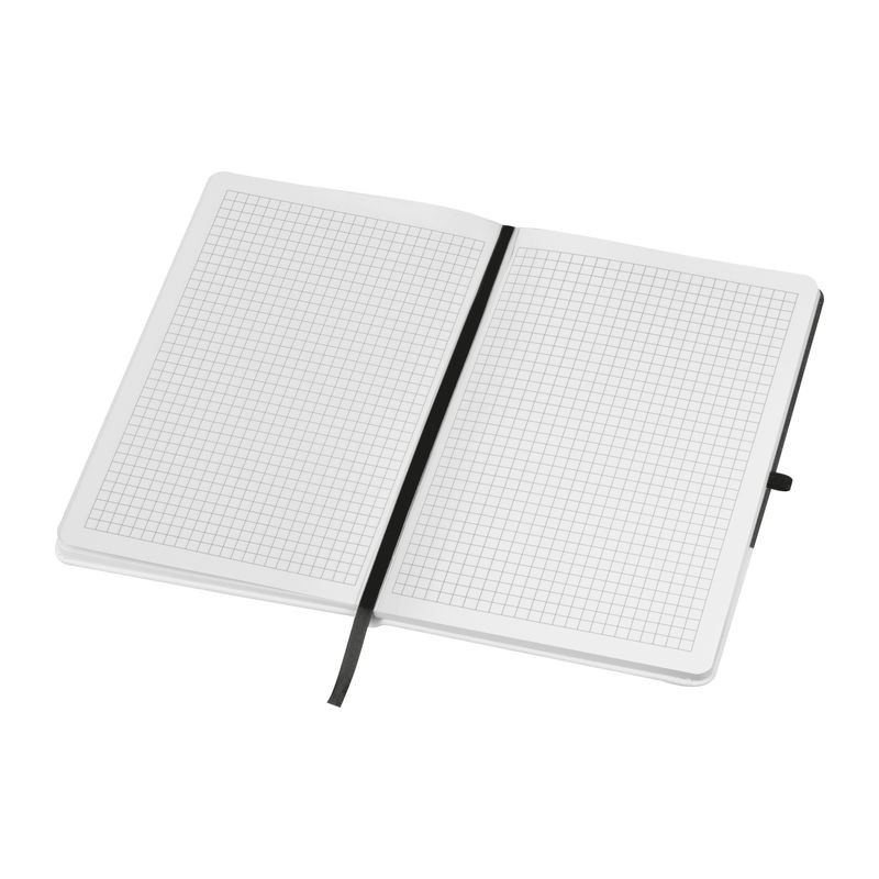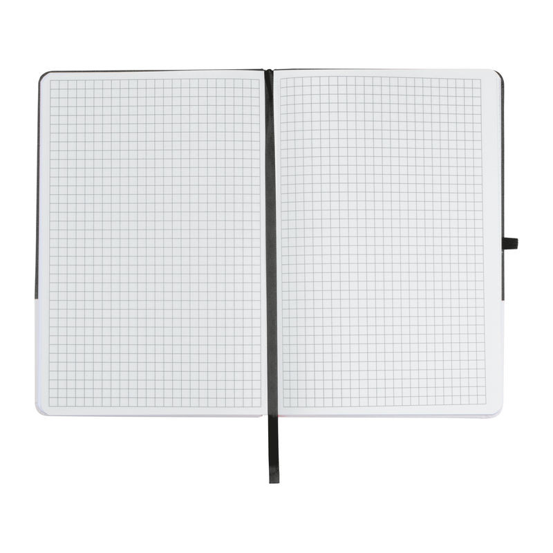 A5 méretű jegyzettömb, 160 kockás oldallal, PU borítással, könyvjelzővel, tolltartó hurokkal, rugalmas gumipánttal.