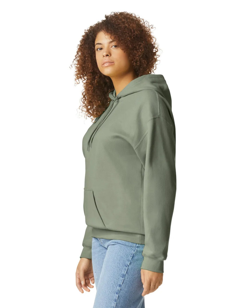 A Softstyle Midweight Fleece kapucnis pulóver 80% gyűrűs fonású pamut és 20% poliészter keverékéből készült, puha belsővel és pamutbarát dekorációkhoz ideális külső felülettel. Ejtett vállú, kenguruzsebes, spandex mandzsettás és alsó szegélyes, klasszikus varrás nélküli fazon, fekete kitéphető címkével, amelyet hamarosan újrahasznosított címkére cserélnek.