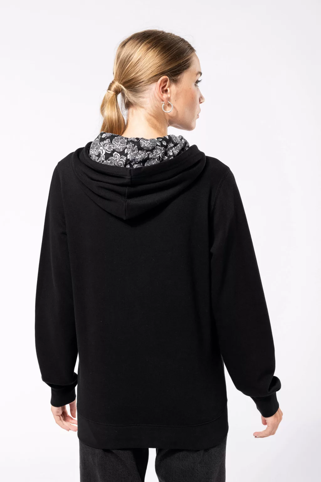 • Nyomott mintás pamut jersey anyaggal bélelt kapucni és kontrasztos húzózsinór