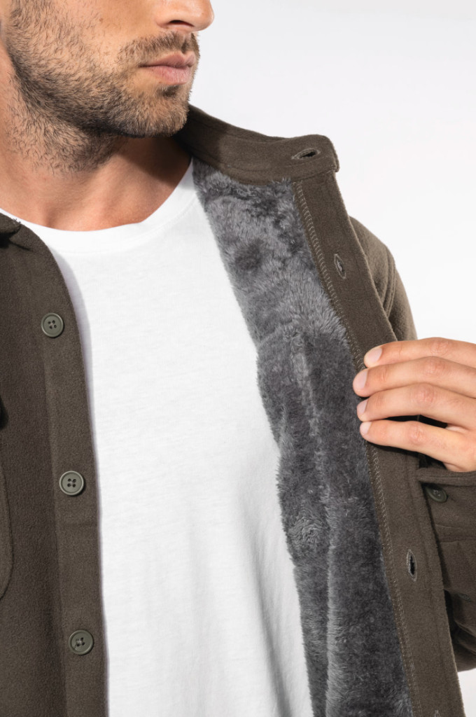 100% poliészter Microfleece külső és sherpa belső Nagyon puha és meleg overshirt 2 zsebfedős mellzseb Klasszikus nyakkivágás (2 tartalék gomb) Gombbal állítható mandzsetták Lekerekített szegély
