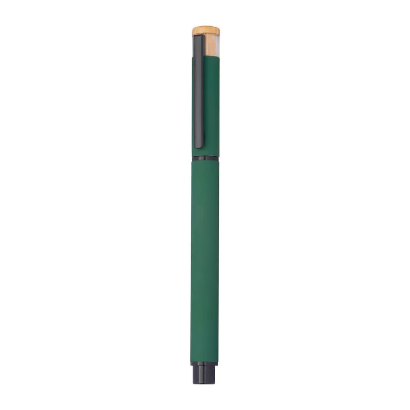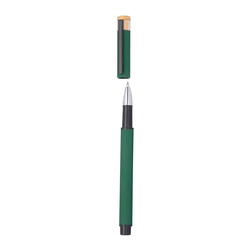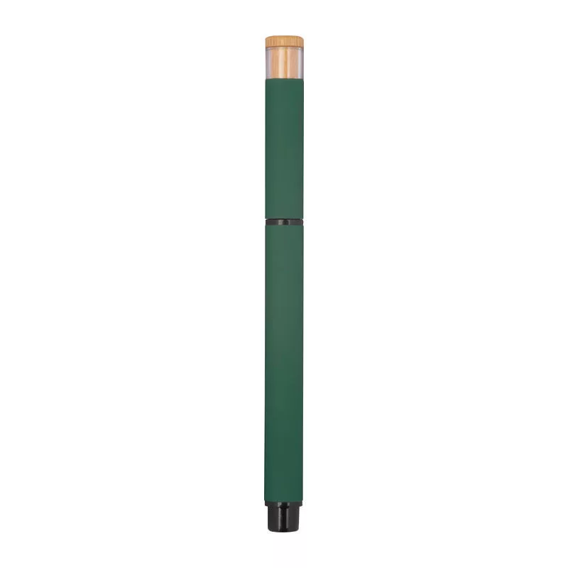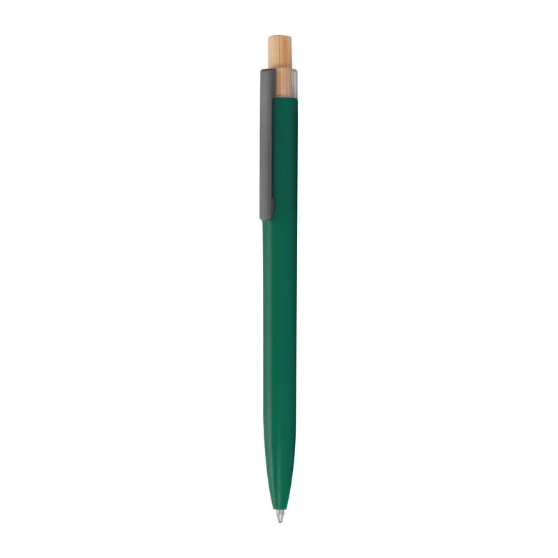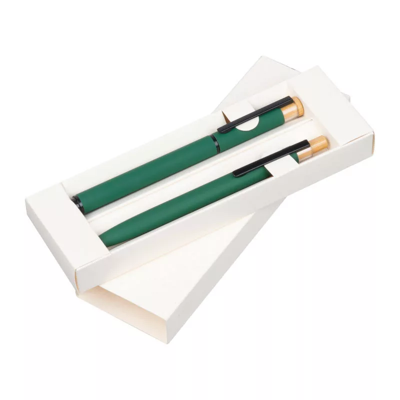 Írószer szett, amely egy kék színű, zselés (Semi-Gel) tollbetéttel ellátott golyóstollat és egy rollertollat tartalmaz újrahasznosított alumíniumból. Fém klipsz és bambusz nyomógomb tartozik hozzá, környezetbarát dobozban szállítva.