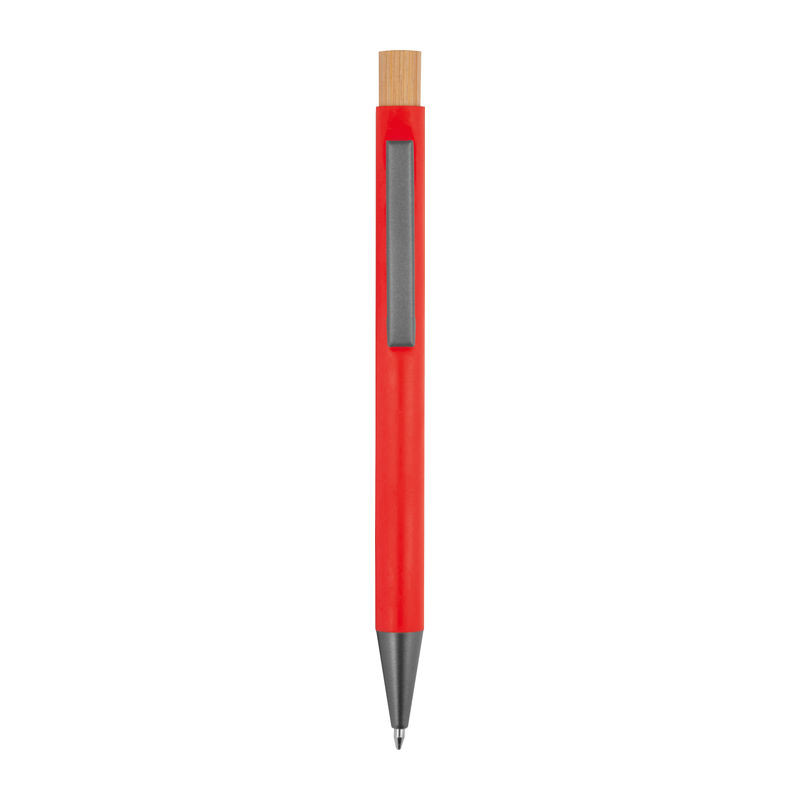 Újrahasznosított alumíniumból készült golyóstoll bambusz nyomógombbal, matt fém klipszszel és kék színű, jumbo tollbetéttel.